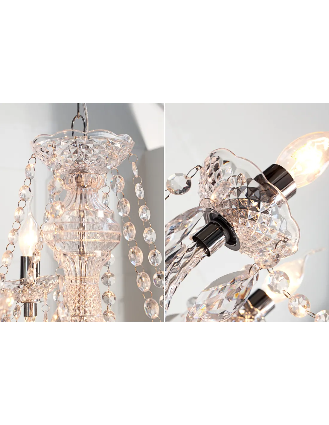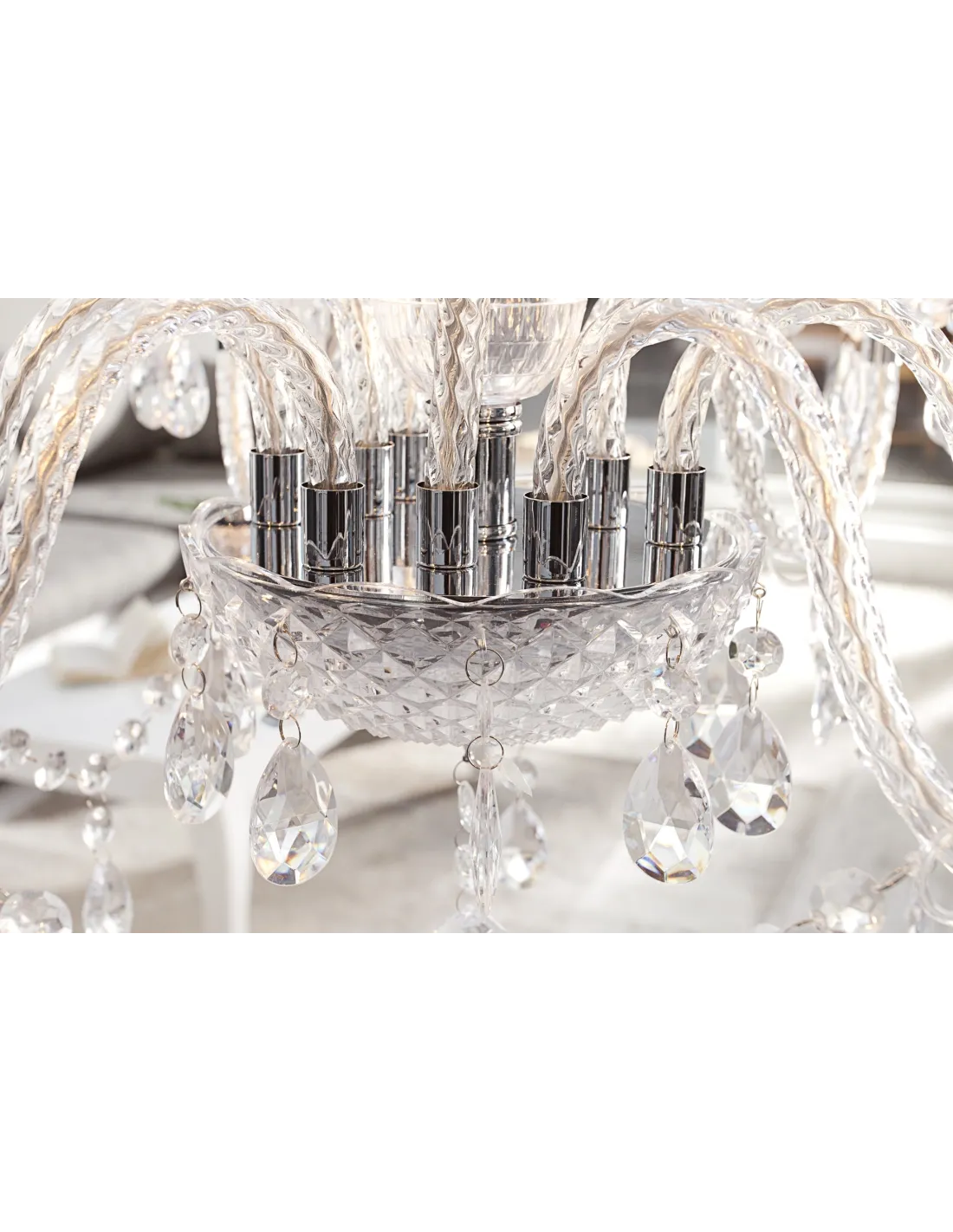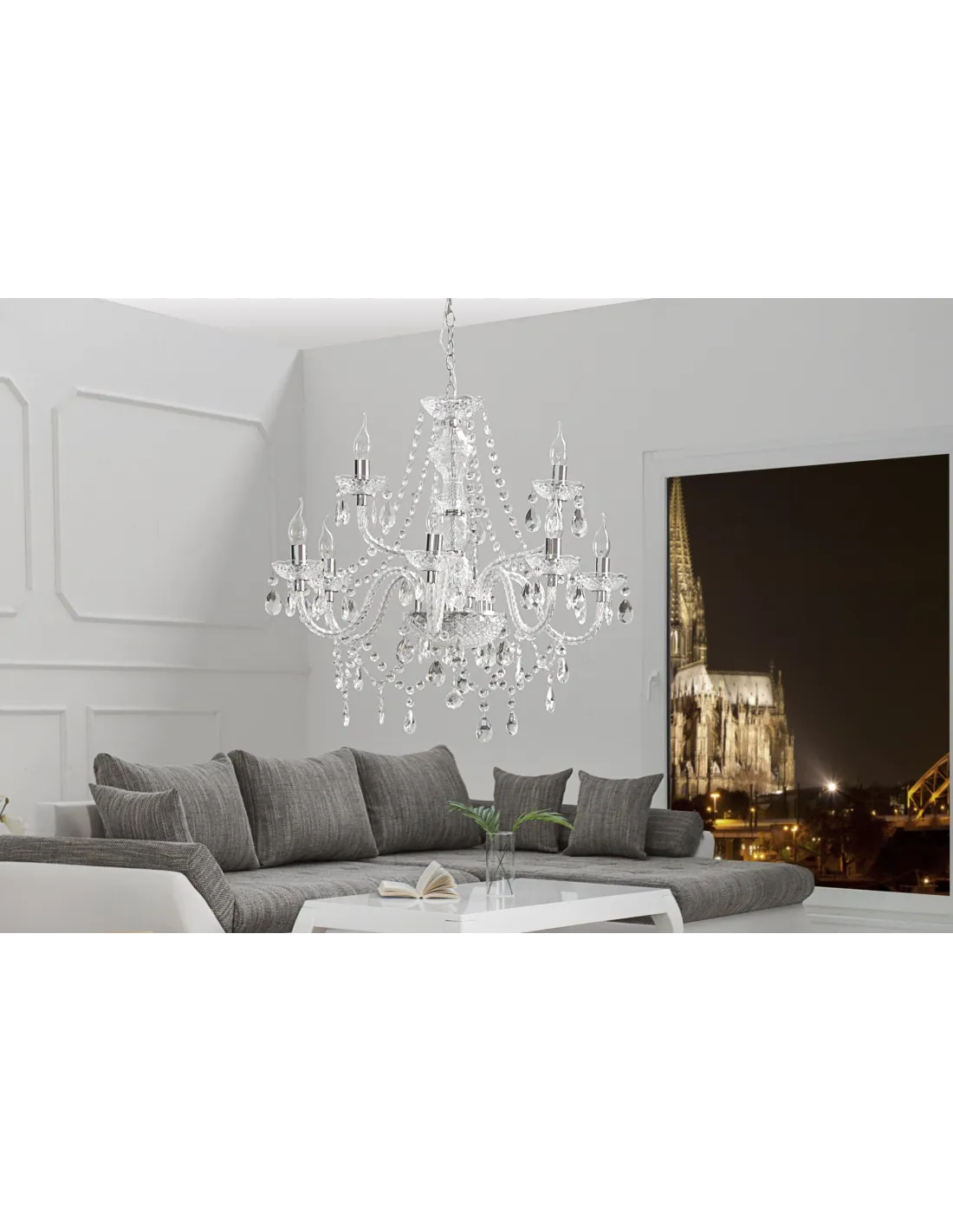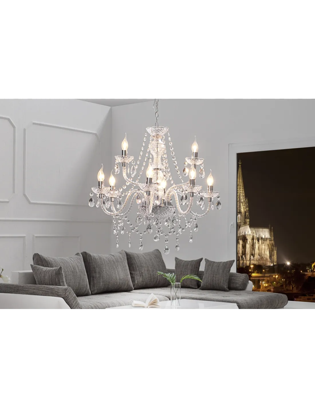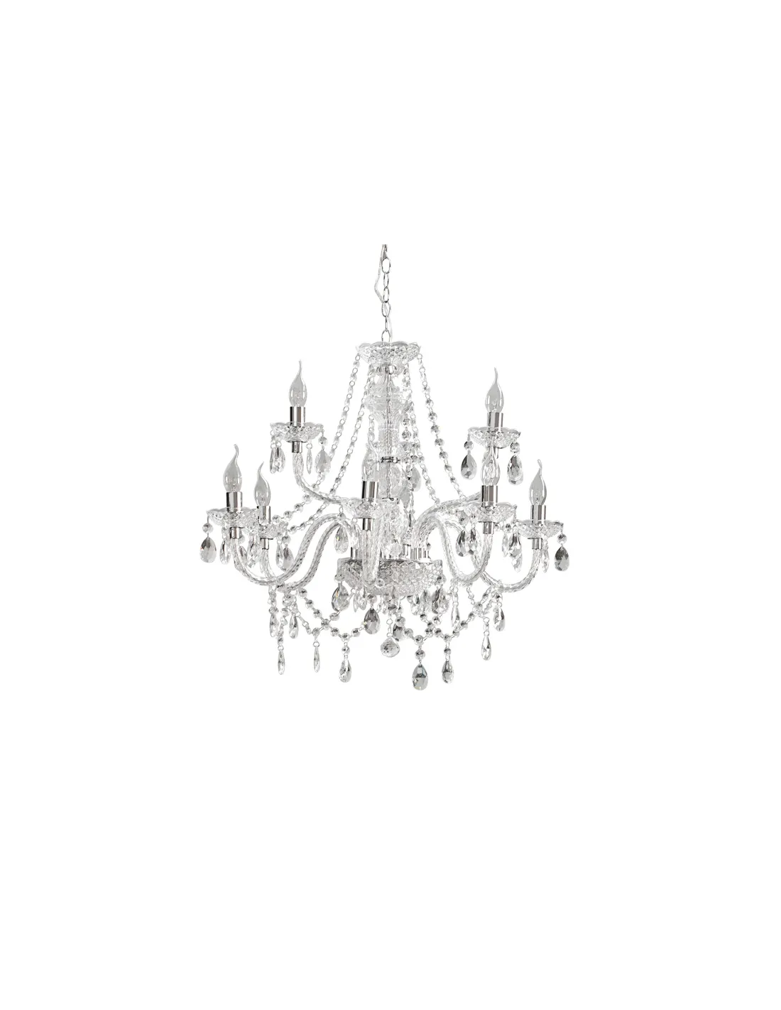 Un lustre transparent avec 9 branches sous forme de bougies offre une ambiance design et chic pour votre intérieur.