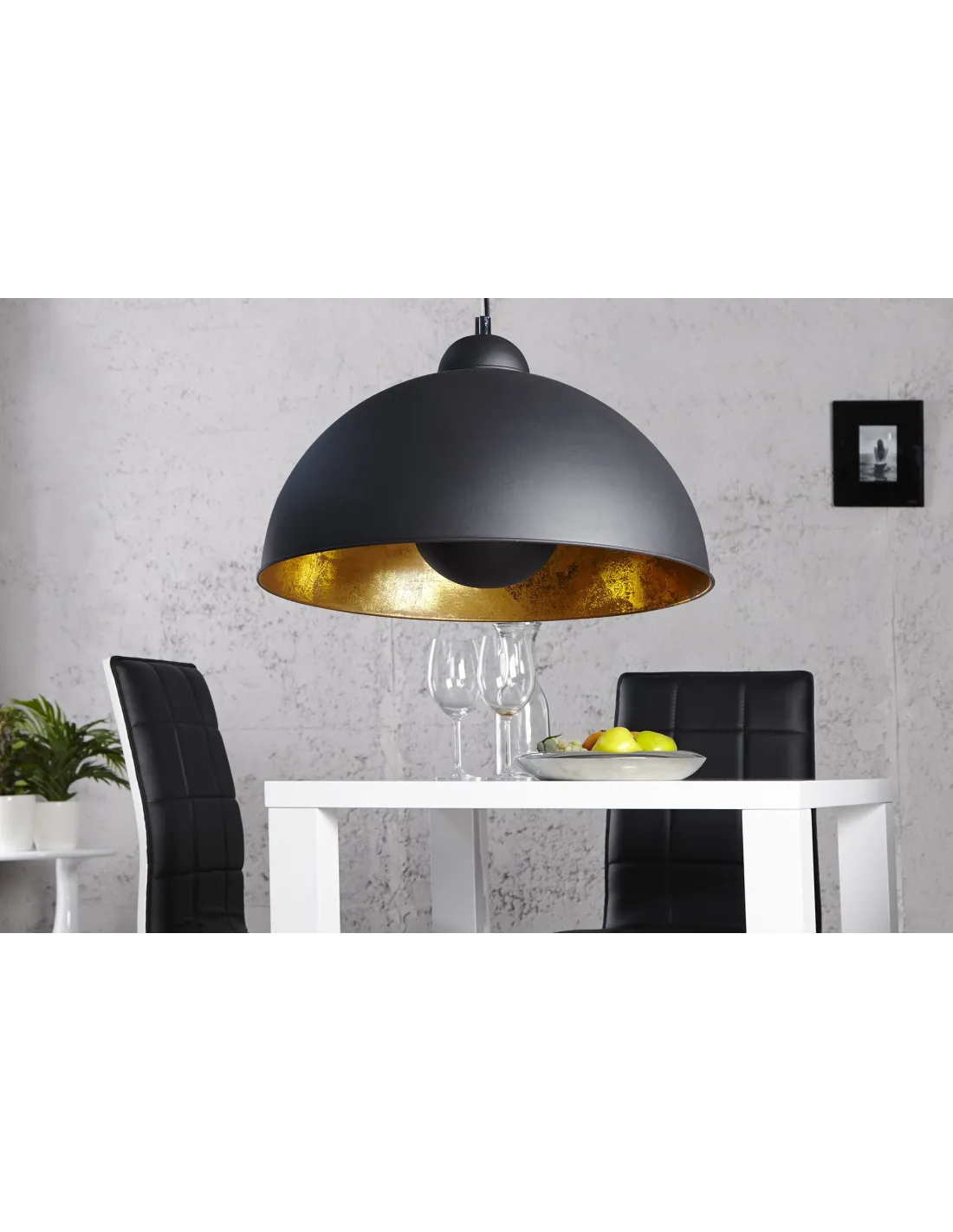 Une lampe suspendue en aluminium et acier inoxydable garantira un décor unique et très élégant à votre intérieur, avec sa forme hémisphérique, sa couleur noir à l’extérieur, son ton d'or à l’intérieur vous offrira un style et une lumière très chaleureuse.