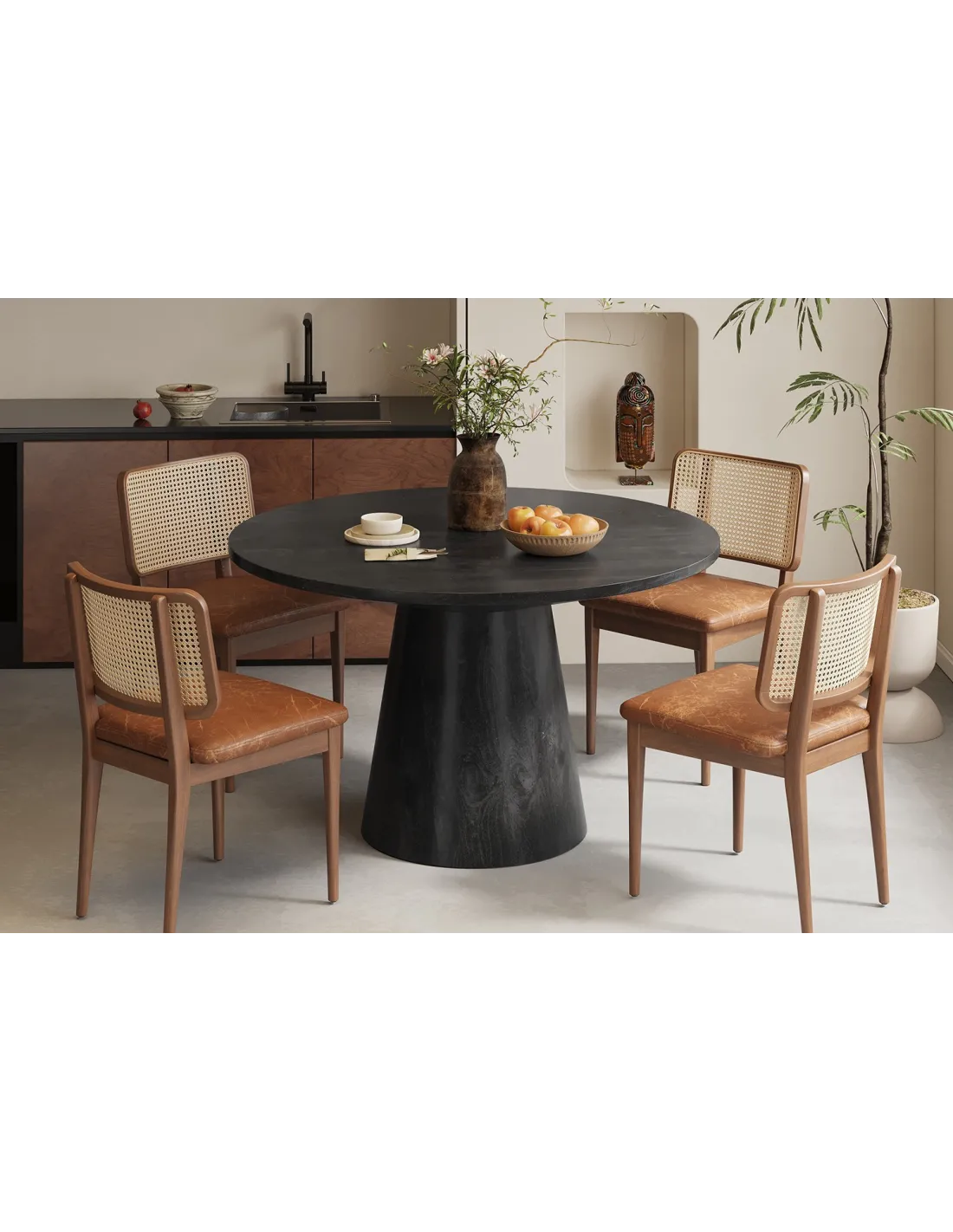 - Design : Table ronde, idéale pour les repas en famille ou entre amis, ajoutant une touche chaleureuse et sophistiquée à votre espace.