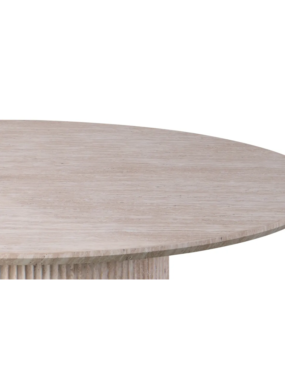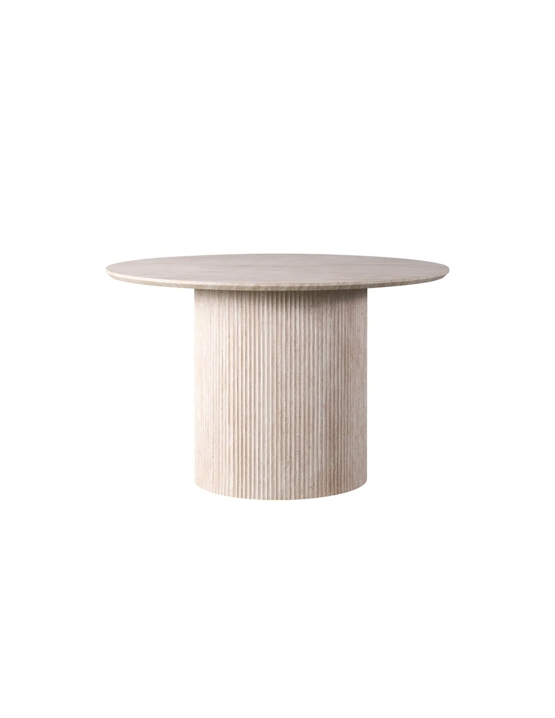 La table LAGOS 120 cm ronde décor travertin beige combine praticité et raffinement.