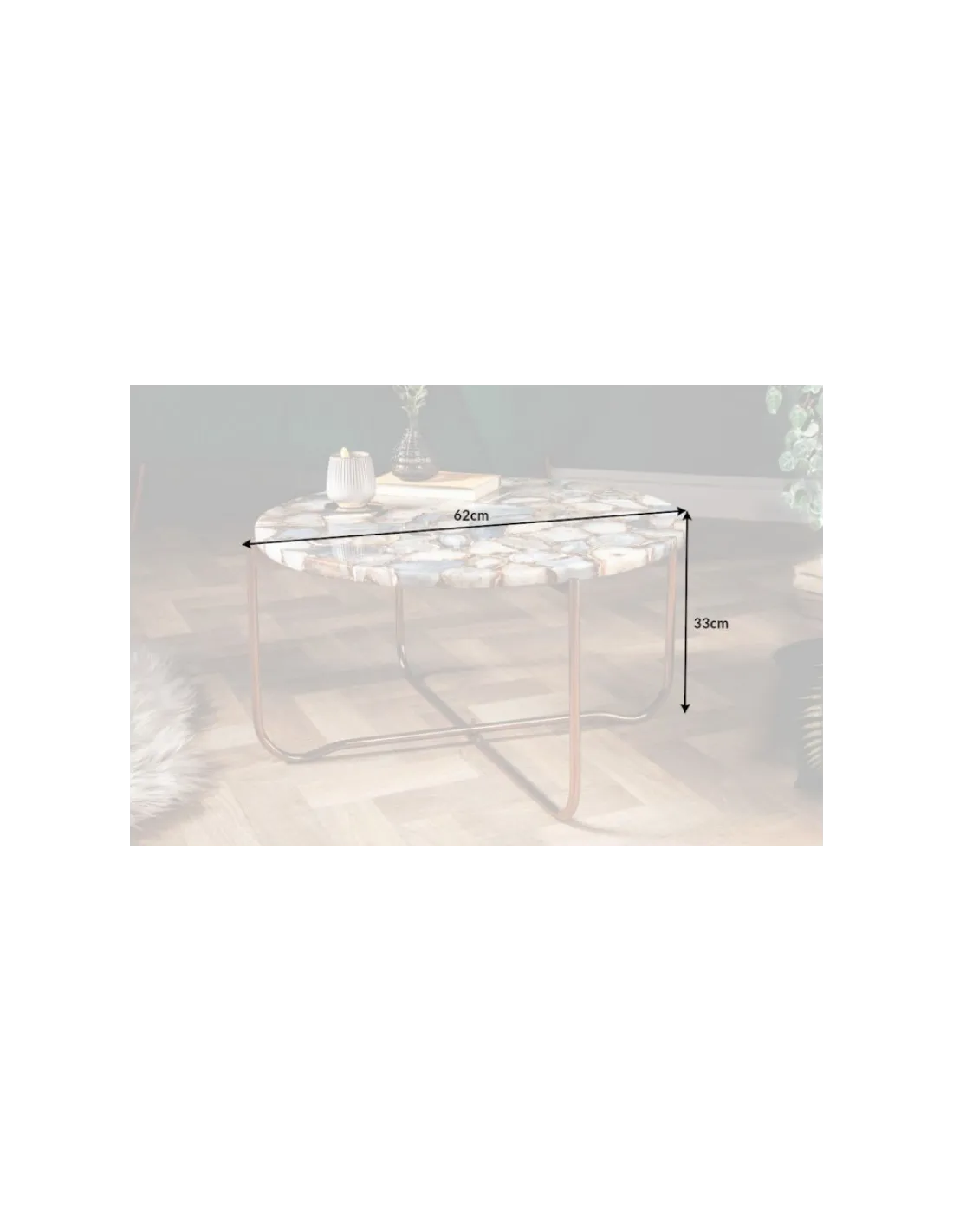 - 62cm x 33cm x 62cm (LxHxP) Pieds de table: 1cm x 1cm Épaisseur de table: 15mm Ø plateau de table: 60cm