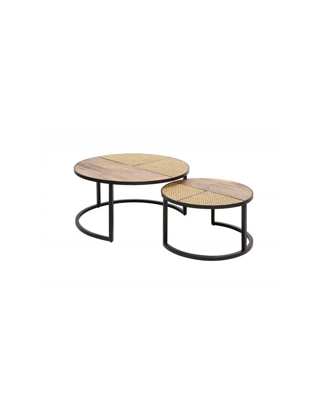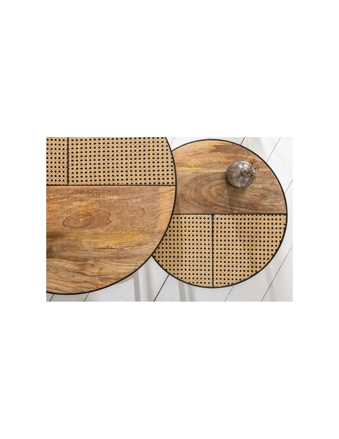 Sublimez votre espace de vie avec cet ensemble de tables d'appoint gigognes. Conçues pour s'adapter à tous les styles d'intérieur, ces tables rondes associent élégamment un plateau en bois massif de manguier et rotin à un cadre en métal noir robuste.