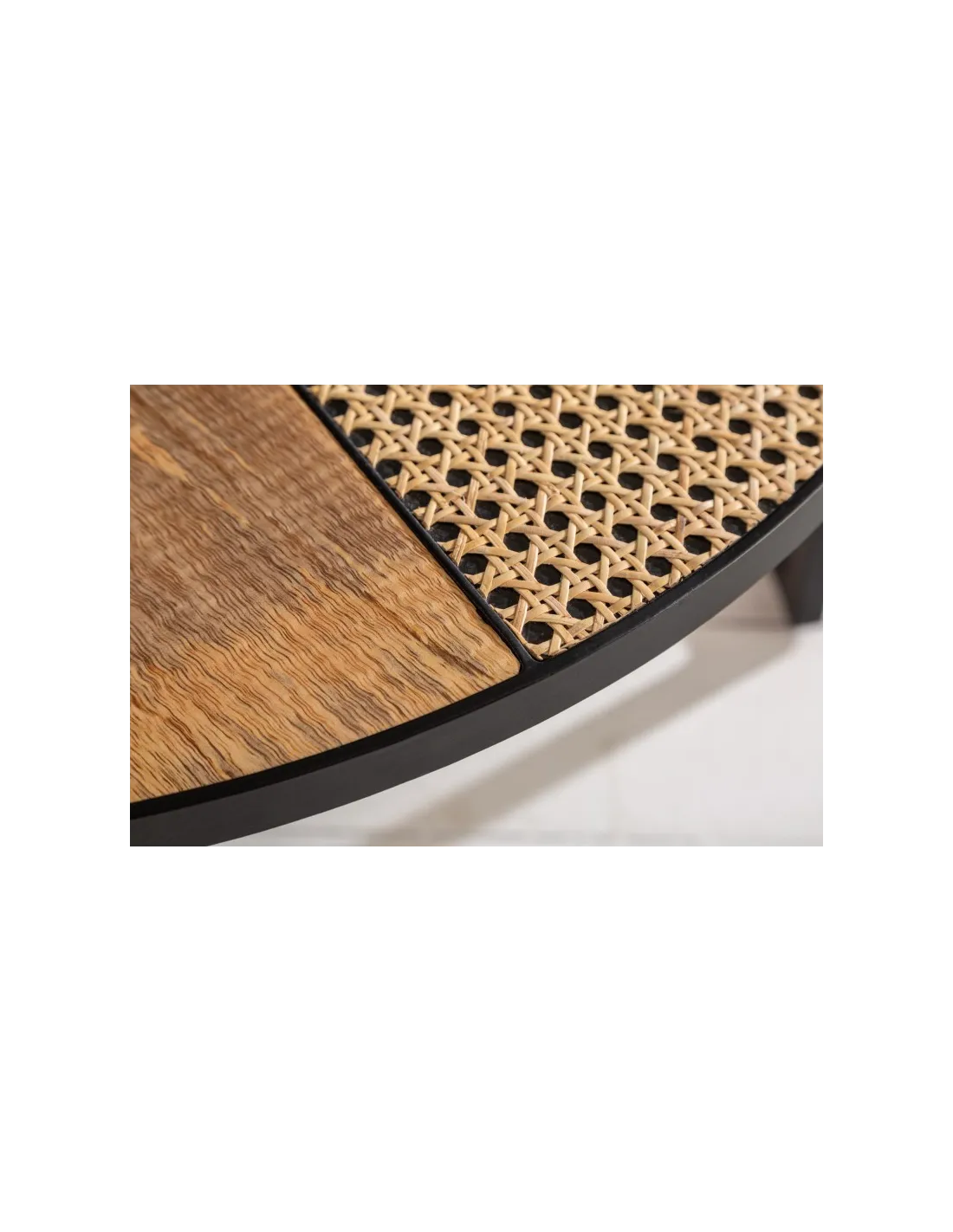 Matériaux : Plateau en bois massif de manguier et rotin naturel, piétement en métal noir