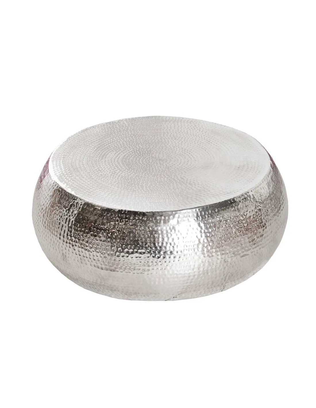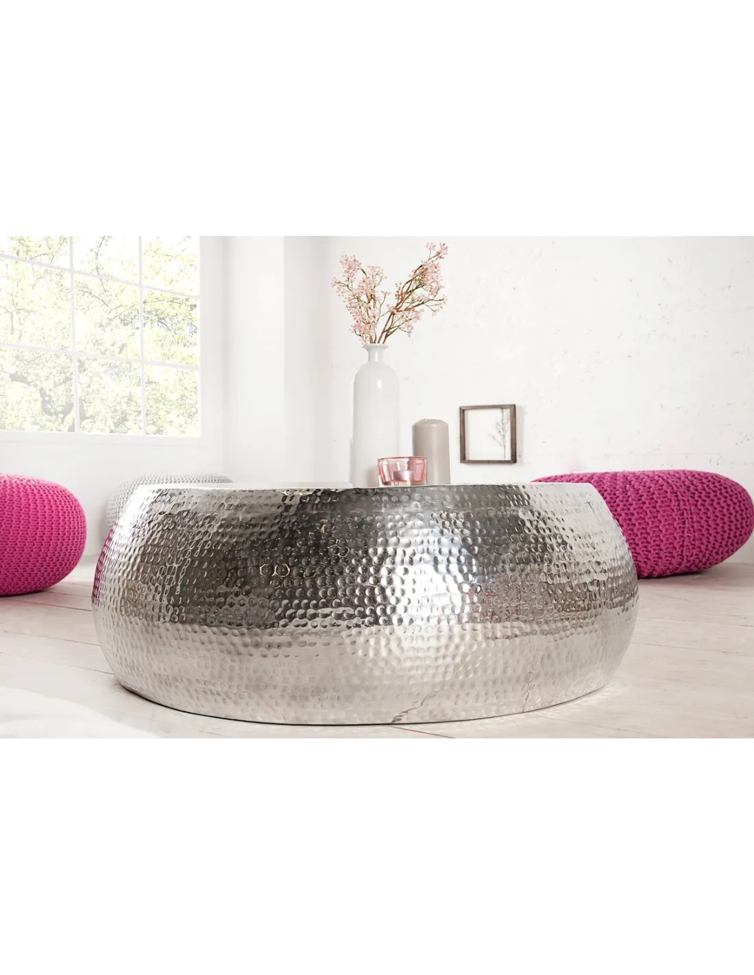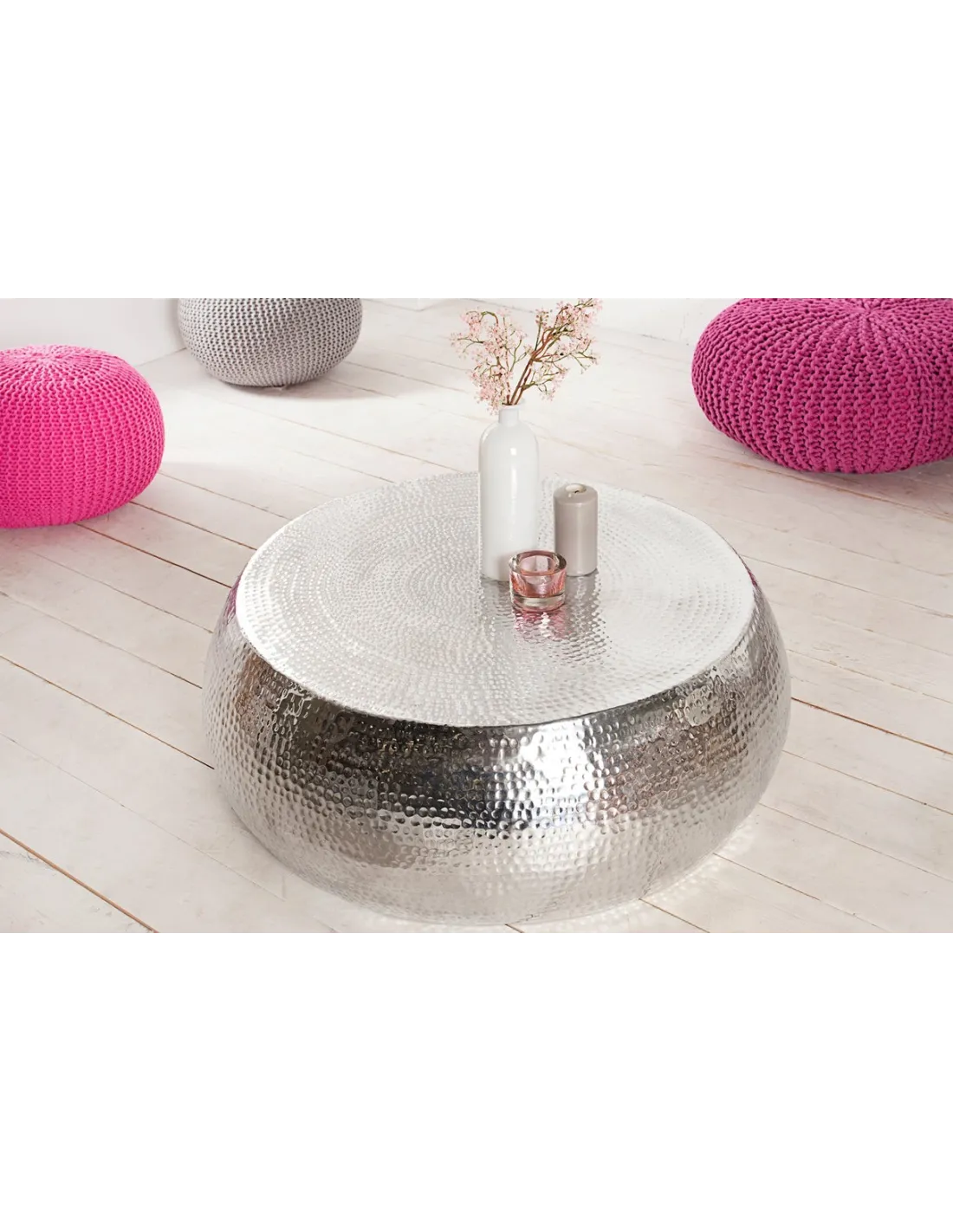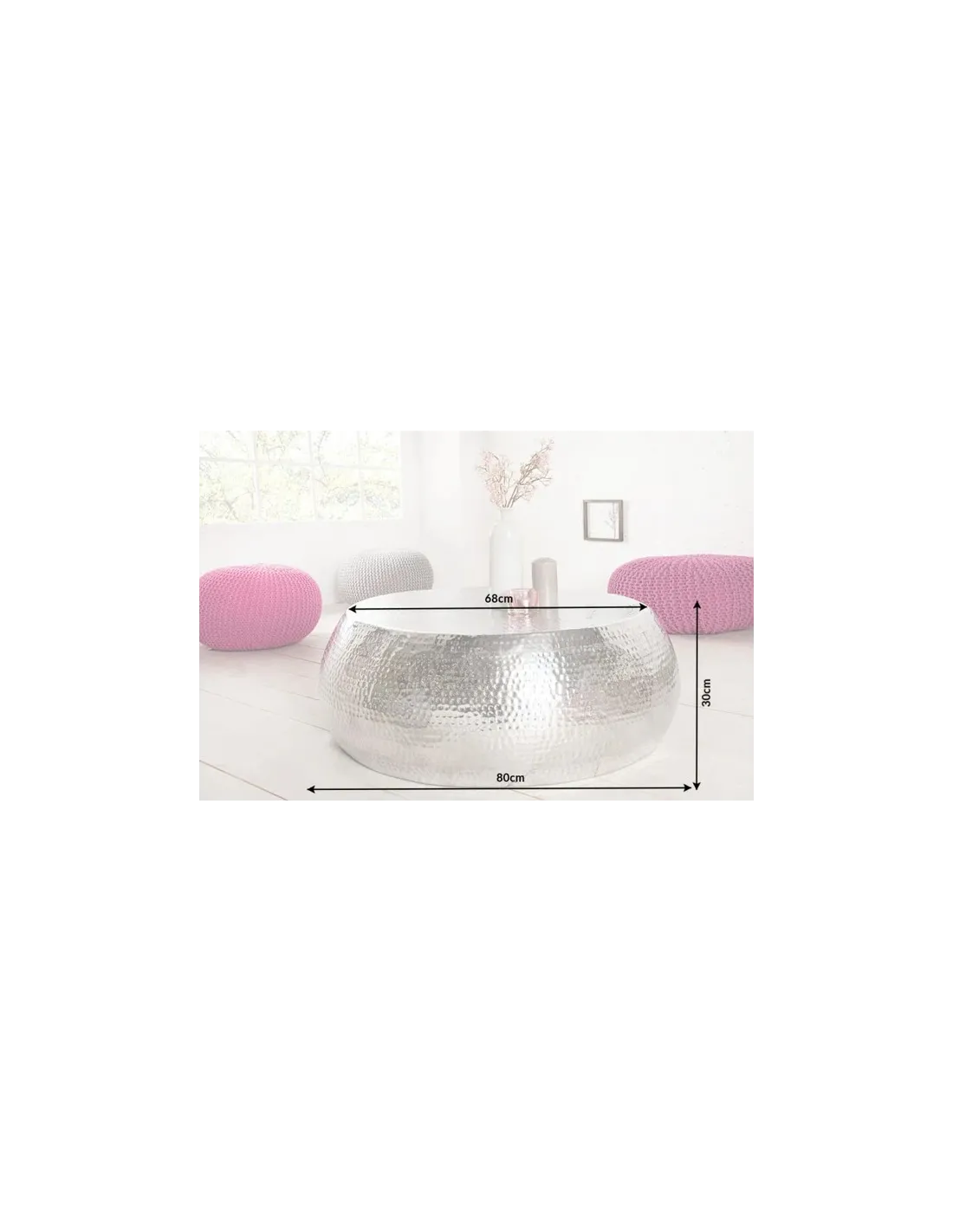 Ajoutez un design oriental moderne à votre salon grâce à cette magnifique table basse ronde, ouverte par le bas et creuse à l’intérieur ! Fabriquée joliment en alliage aluminium-métal de haute qualité de belle couleur argenté avec un aspect martelé ! cette table basse ajoutera une note spéciale à toute décoration !