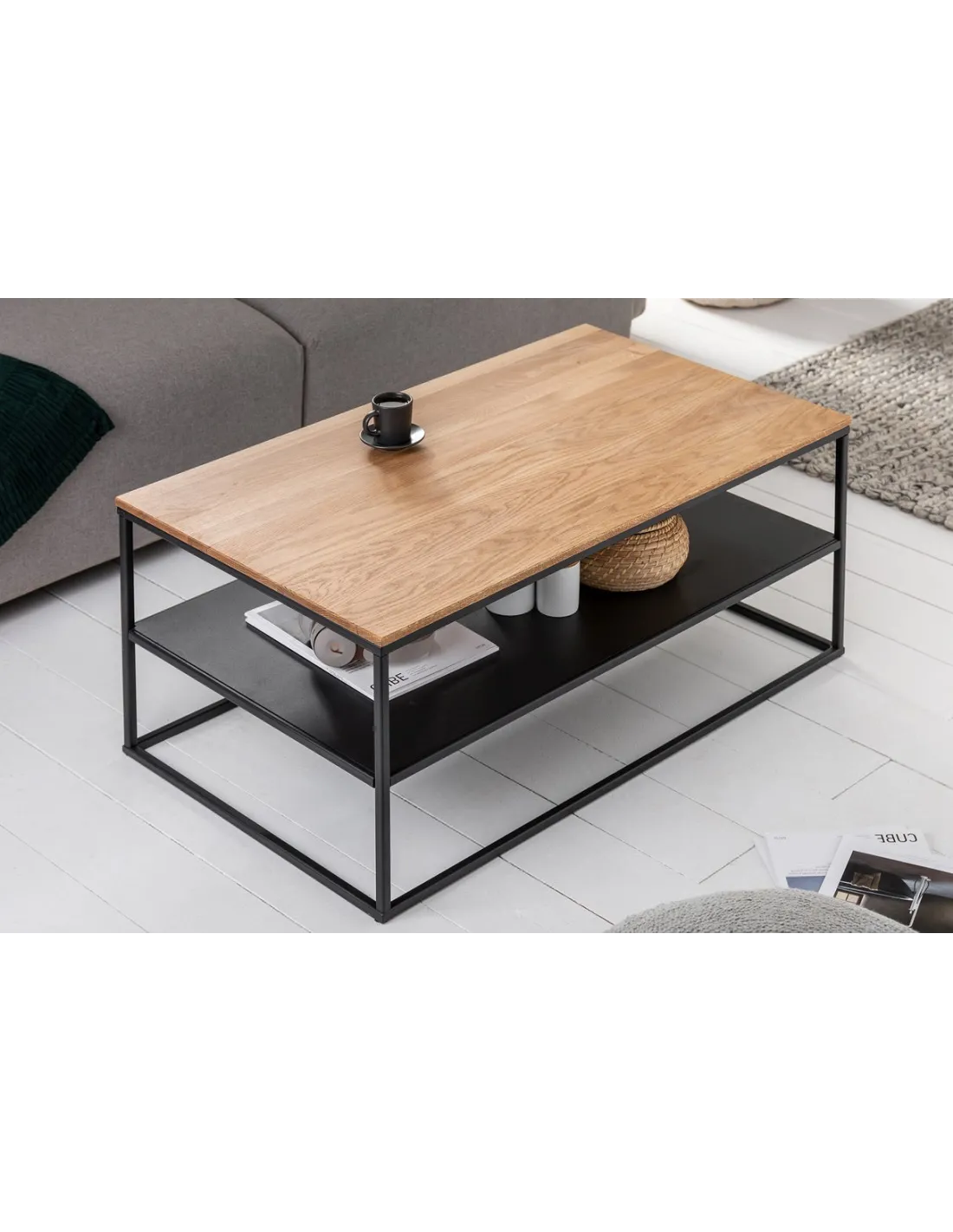 Ajoutez une touche de style industriel et de fonctionnalité à votre espace de vie avec notre table basse équipée d'une zone de stockage. Le plateau en bois massif de chêne apporte une esthétique naturelle et rustique, tandis que le cadre en métal noir lui donne une touche industrielle. Cette table basse offre un espace supplémentaire pour ranger des magazines, des télécommandes ou d'autres articles essentiels.