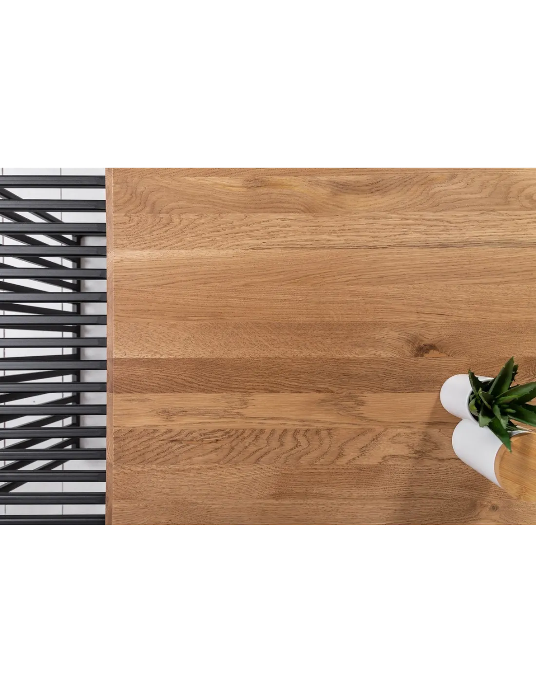 Le plateau de table en bois massif de chêne est à la fois robuste et durable, offrant une surface fiable pour vos besoins du quotidien. Le cadre en métal noir est conçu pour résister à l'usure quotidienne tout en apportant une touche de modernité.