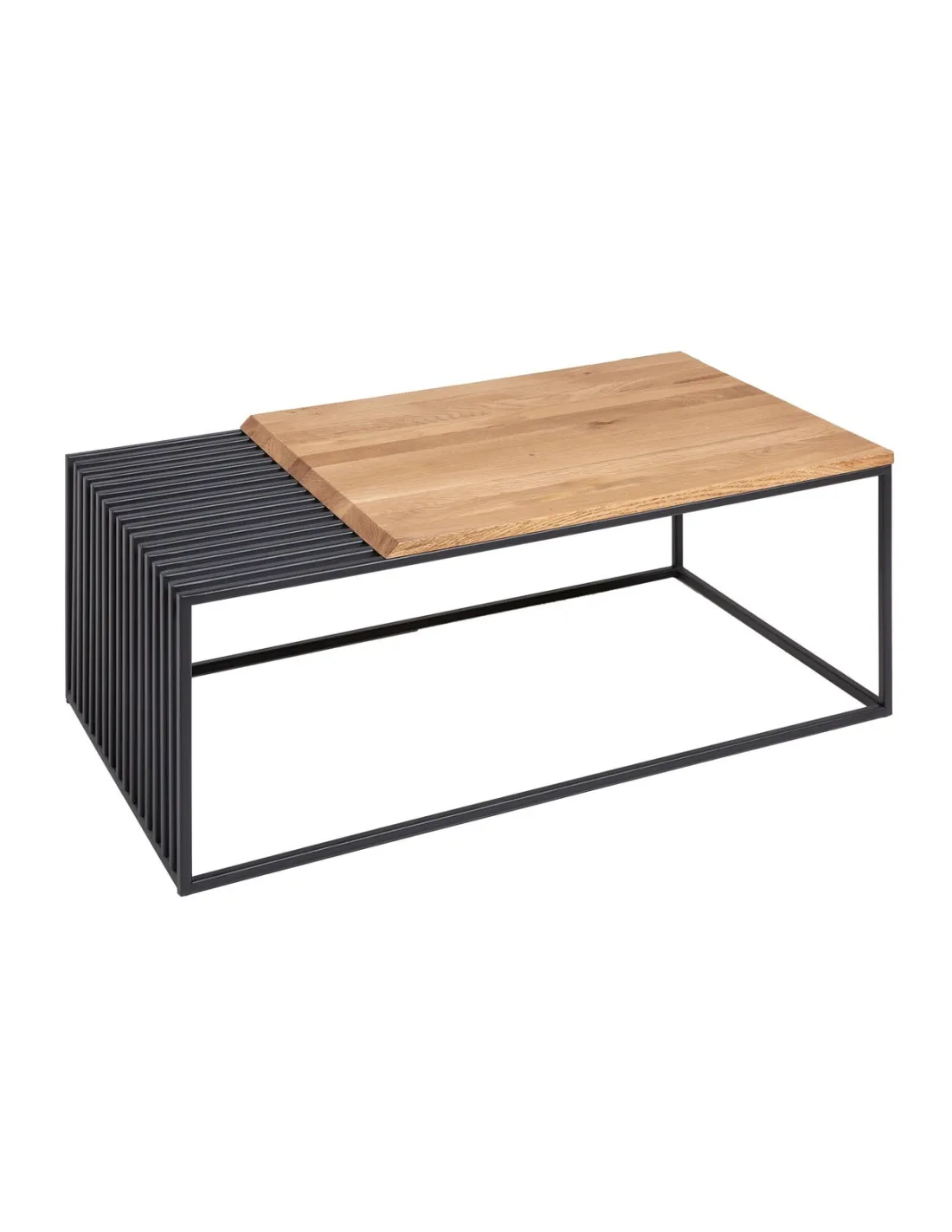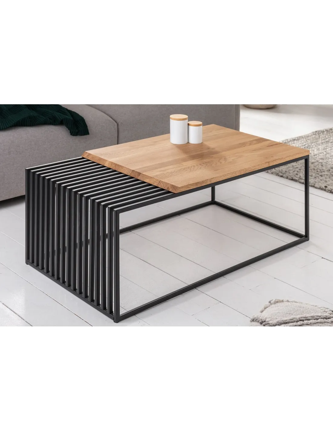 Apportez une touche de charme industriel à votre espace de vie avec notre table basse en bois massif. La combinaison du bois de chêne naturel et du cadre en métal noir crée une esthétique qui met en valeur le style industriel. Cette table est non seulement un élément de décoration, mais également un espace pratique pour poser vos boissons, livres, et autres objets du quotidien.