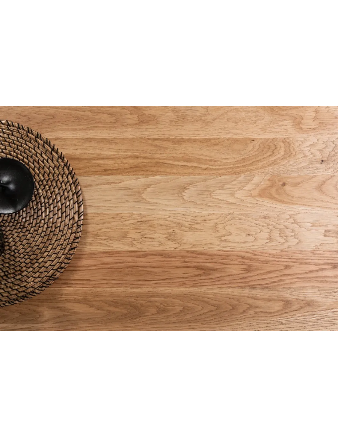Le plateau de table en bois de chêne massif est à la fois robuste et élégant, offrant une surface fiable pour vos besoins du quotidien. Le cadre en métal noir est conçu pour résister à l'usure quotidienne tout en ajoutant une touche de modernité.