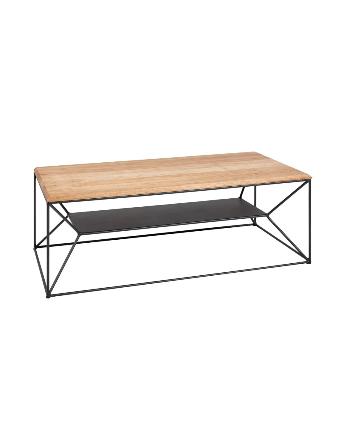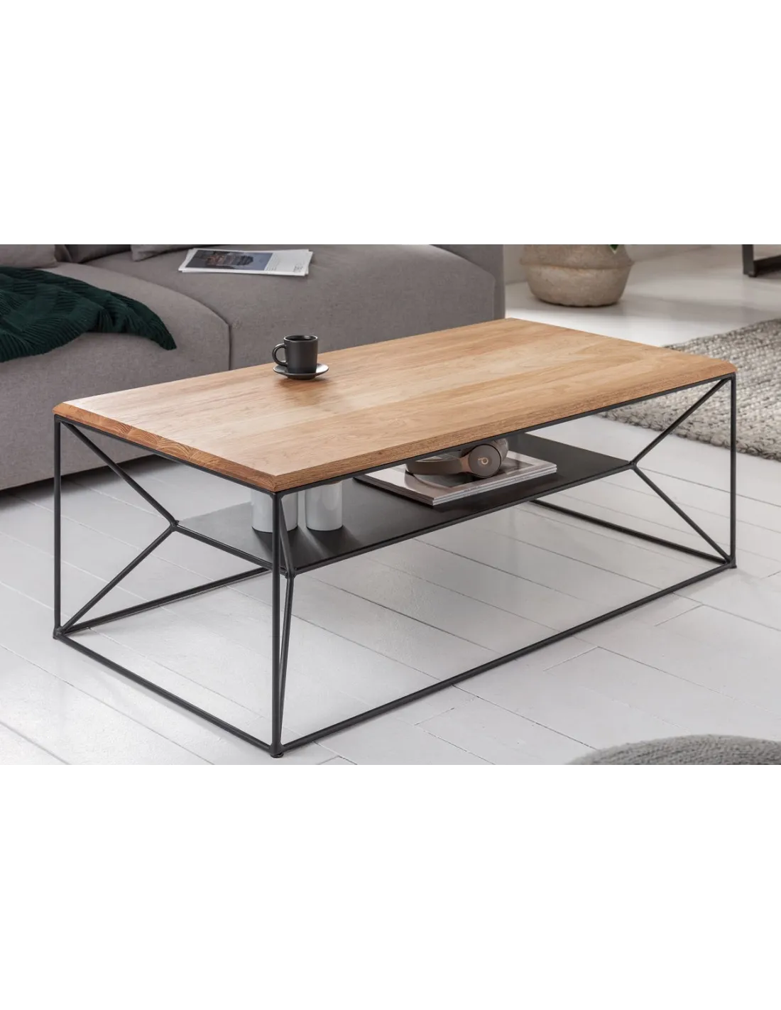 Ajoutez une touche d'esthétique industrielle et de praticité à votre espace de vie avec notre table basse dotée d'une étagère supplémentaire qui semble flotter sous le plateau en bois. Le plateau en bois de chêne massif apporte une touche naturelle, tandis que le cadre en métal noir lui confère un style industriel. Cette table basse offre non seulement un espace pour poser des objets, mais aussi une étagère de rangement pour organiser vos affaires.