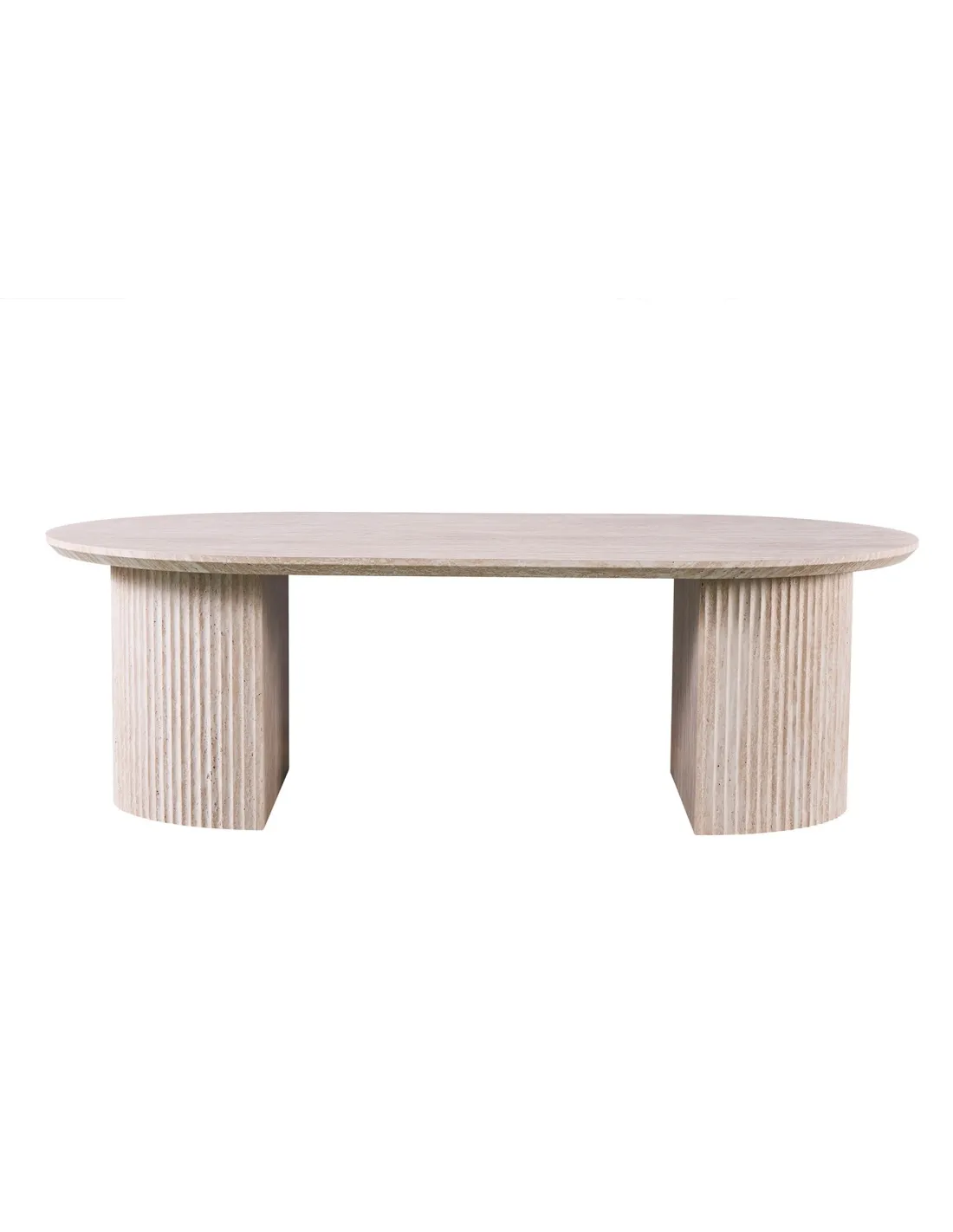 Avec sa forme ovale harmonieuse et son fini clair effet travertin, la table LAGOS diffuse une ambiance apaisante et chic.