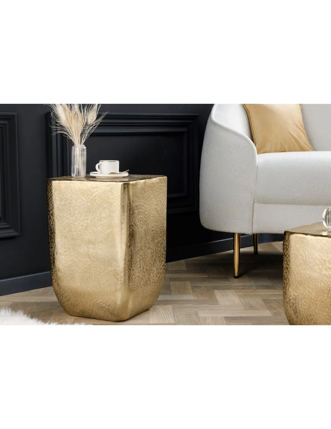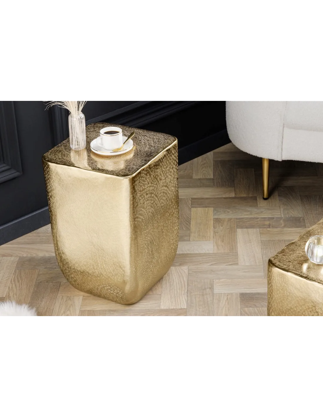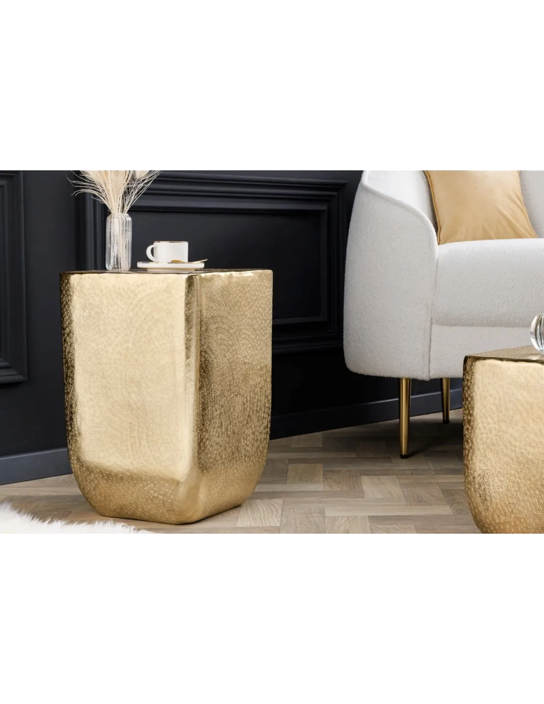 Ajoutez un design oriental moderne à votre salon grâce à cette magnifique table basse unit doré ! Fabriquée joliment en alliage aluminium-métal de haute qualité de belle couleur doré avec un aspect martelé ! cette table basse ajoutera une note spéciale à toute décoration !