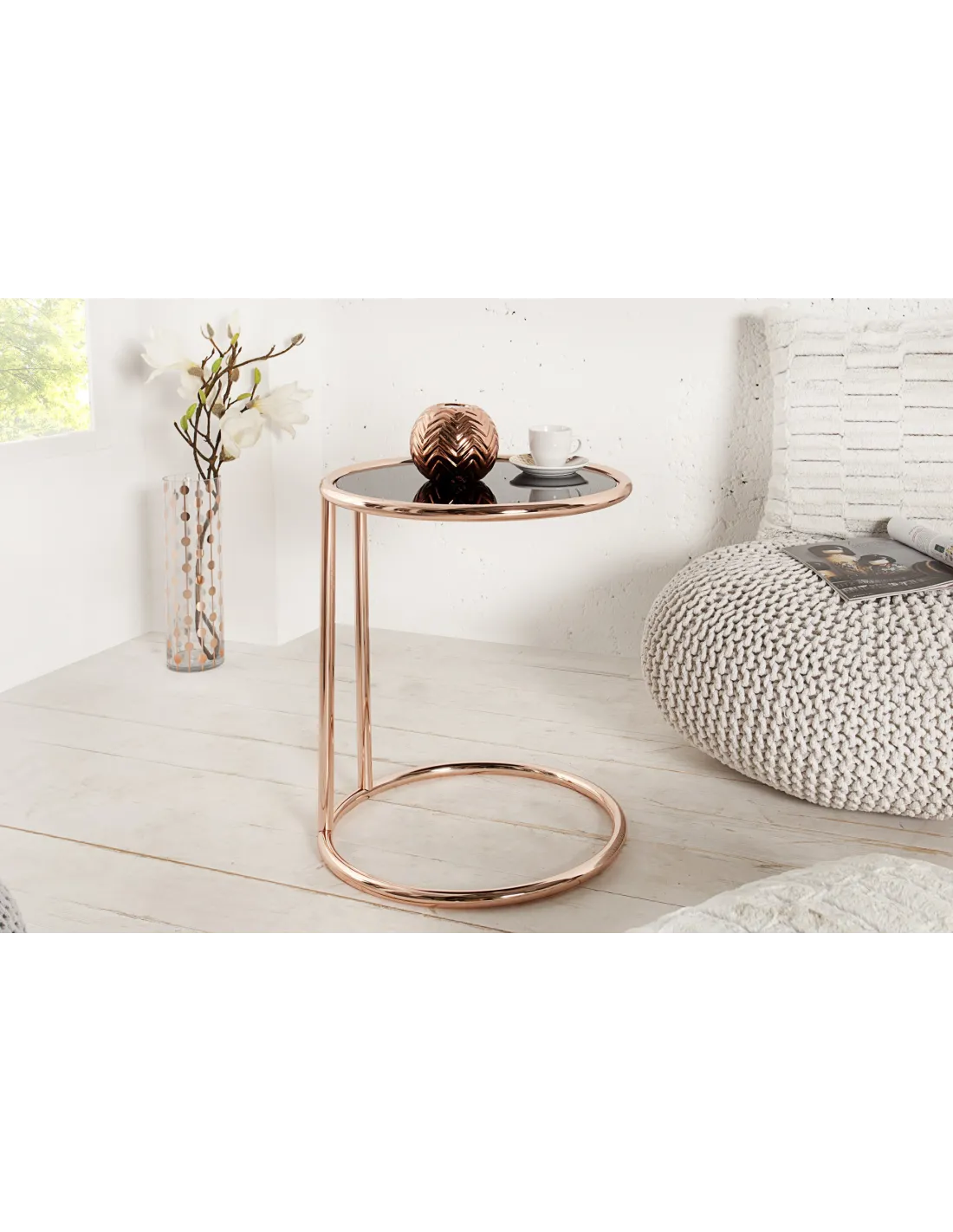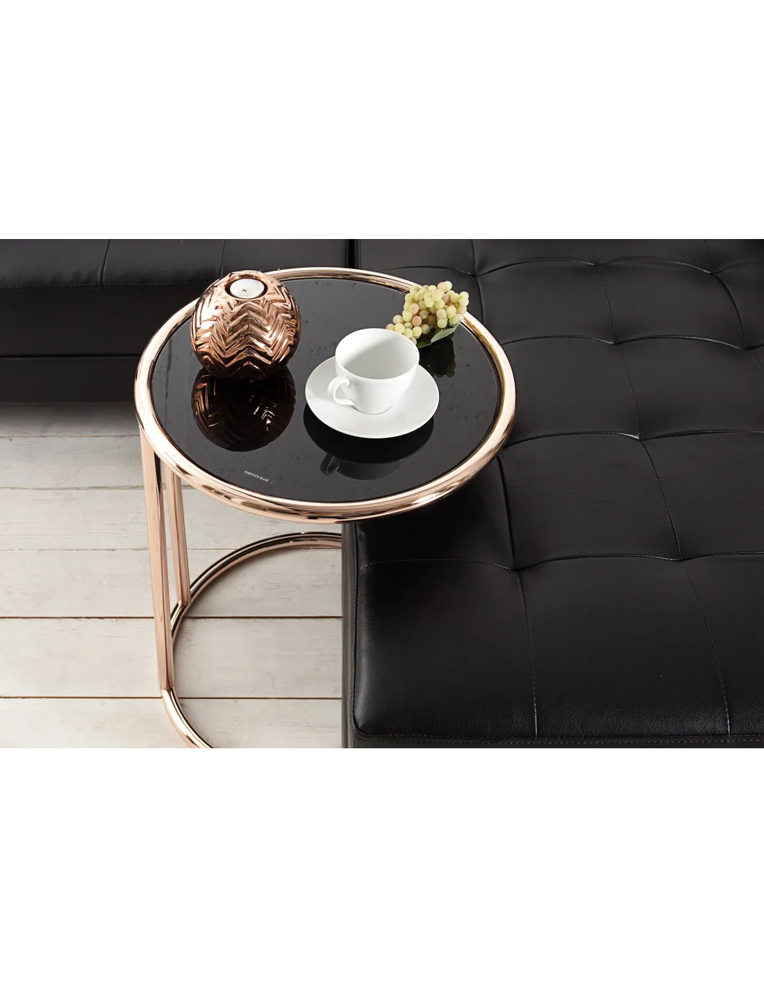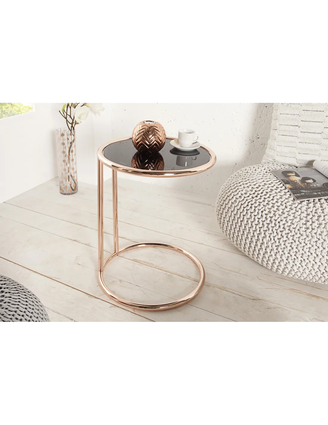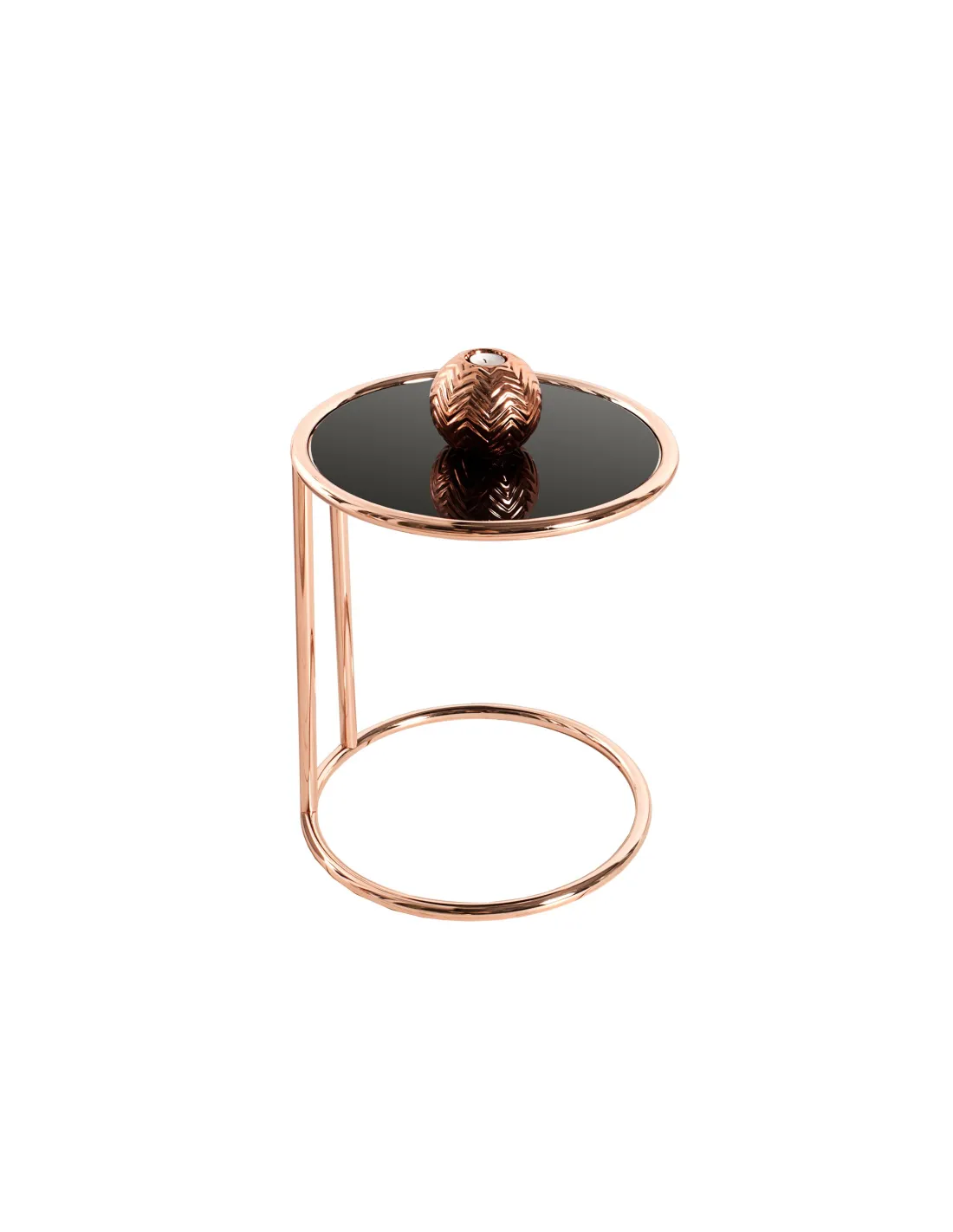 Une table d’appoint innovante constituée avec un plateau en verre noir, et une structure en métal cuivré idéale pour un design moderne à votre intérieur.