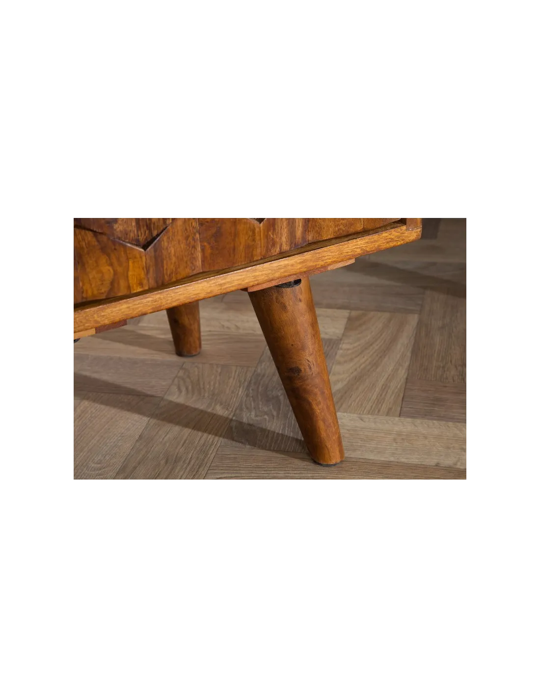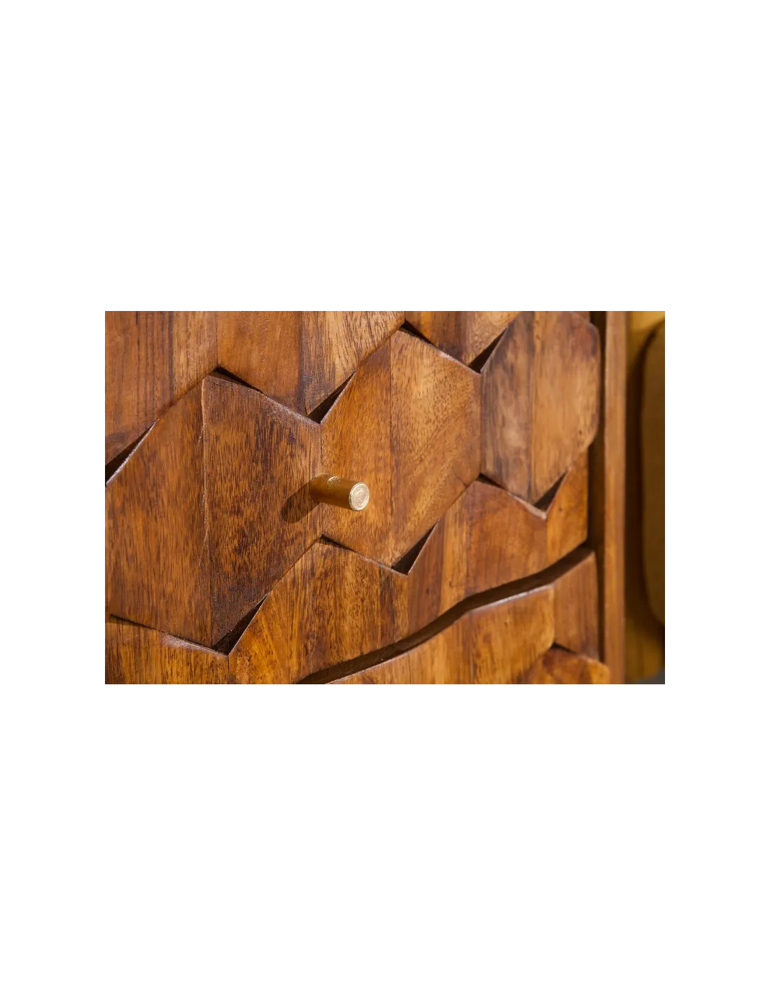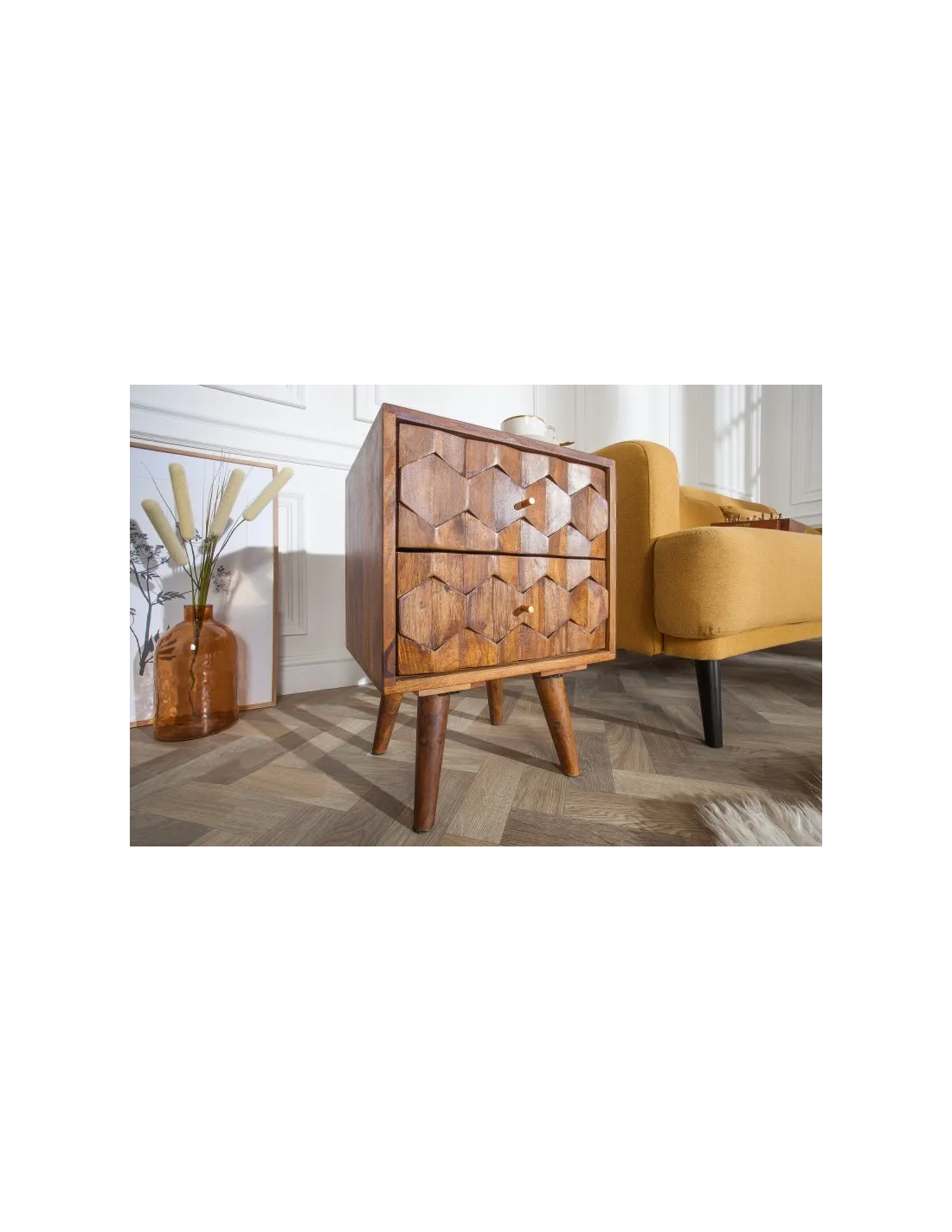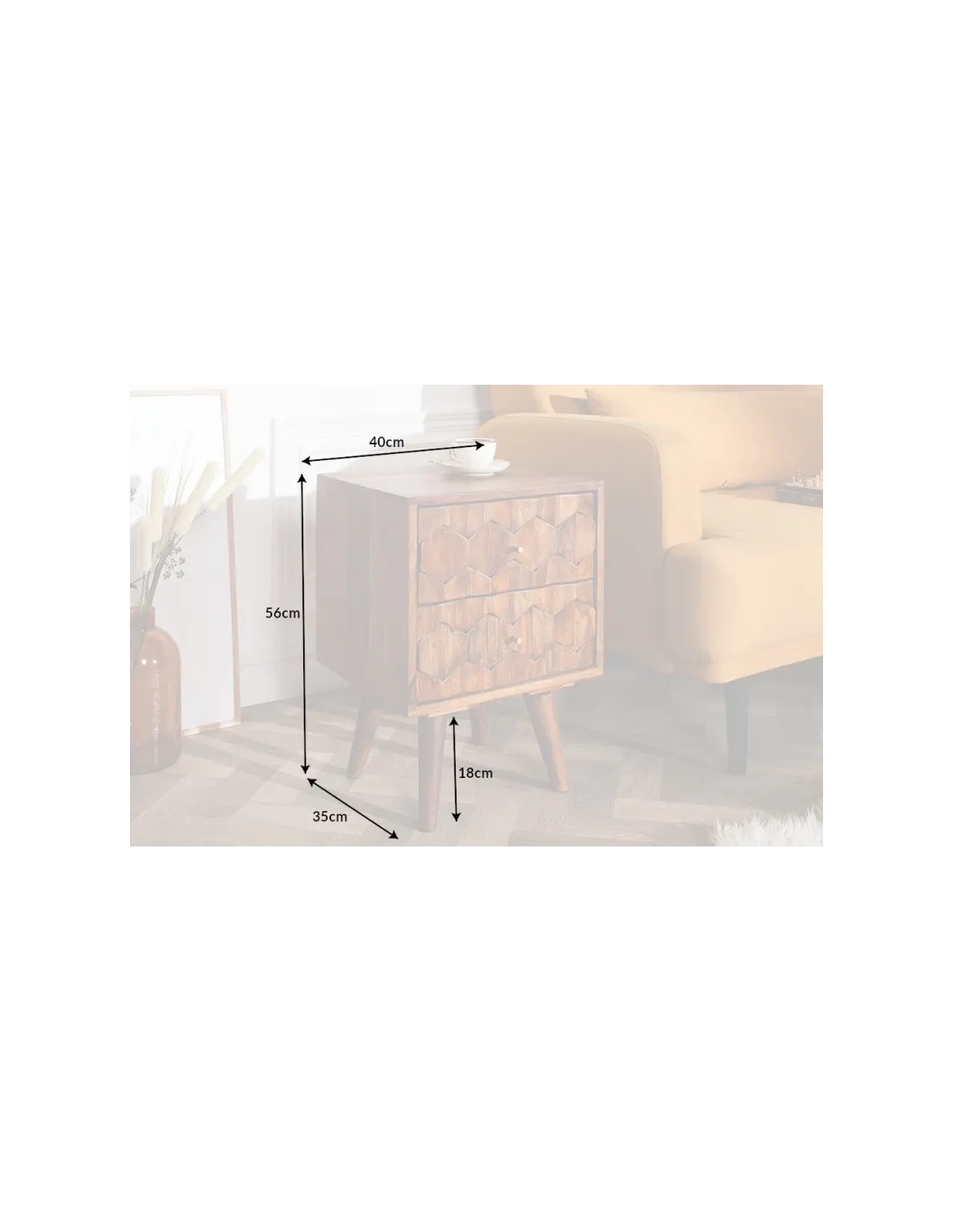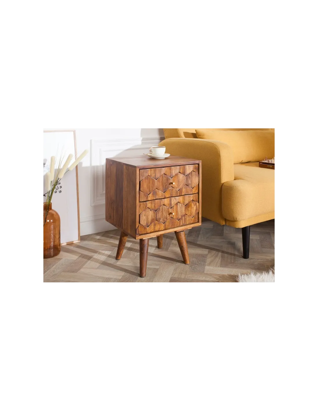 Table de chevet de couleur naturelle dont le design un accroche-regard extravagant. Avec deux tiroirs spacieux, vous pouvez également ranger de petites bagatelles. Idéal pour poser une lampe de table ou objet de décoration.