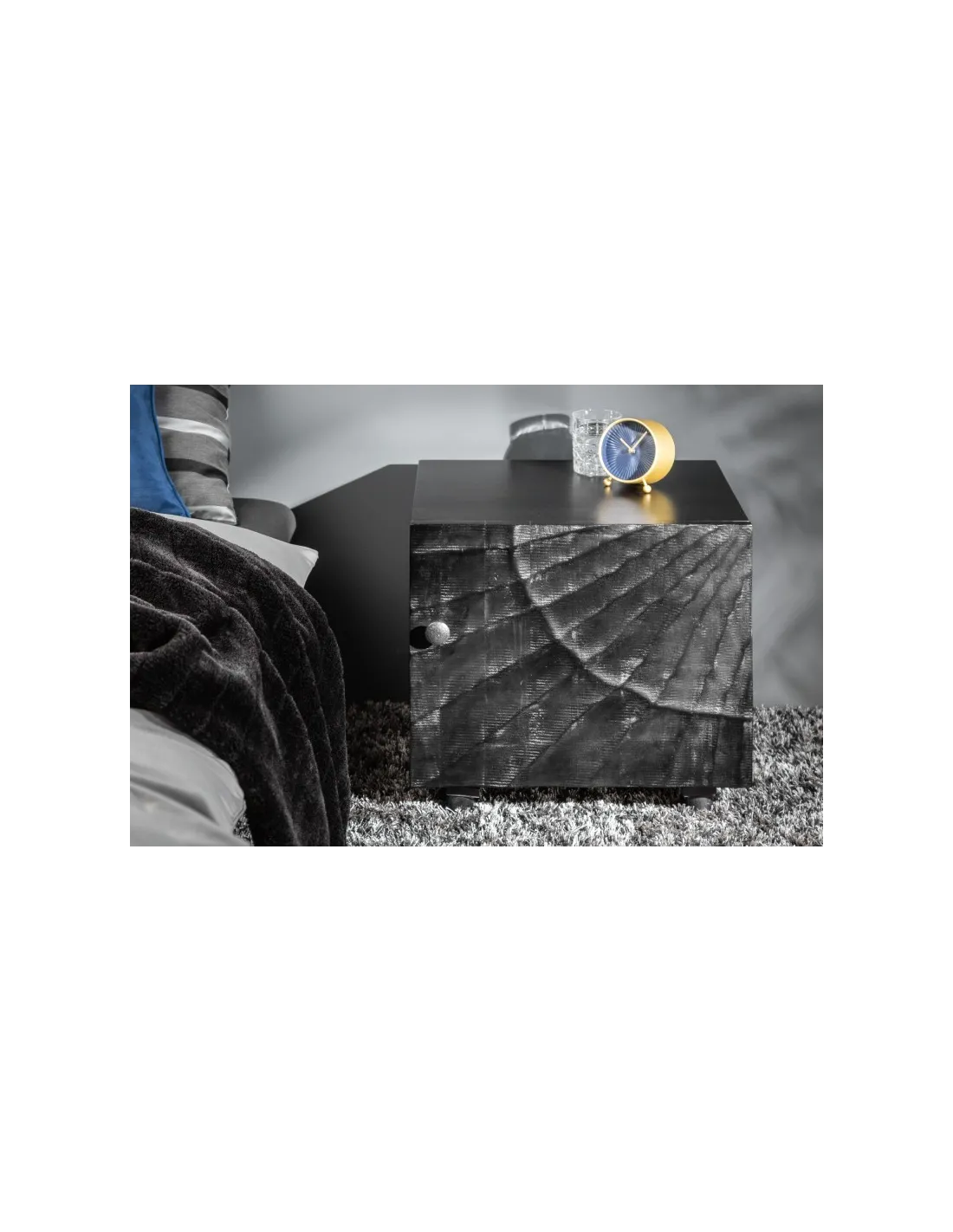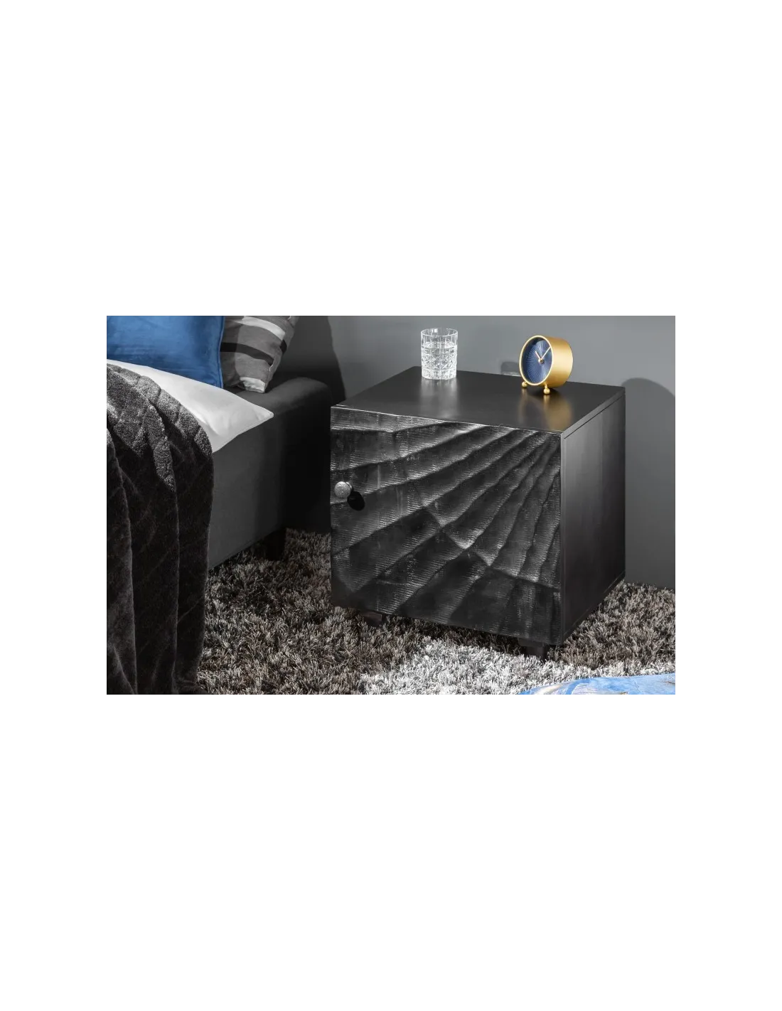 Table de chevet élégante vu le design de sculptassions en 3 dimensions faite à la main. Fabriquée en bois de mangue laqué dont la couleur noir mettra votre pièce en valeur. À son tour, un tiroir pratique pour contrôler le désordre.