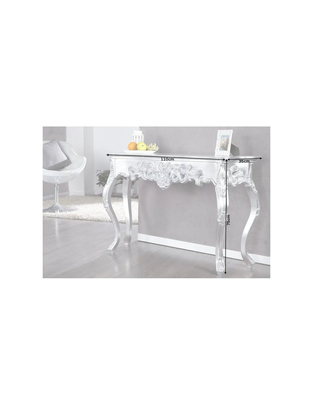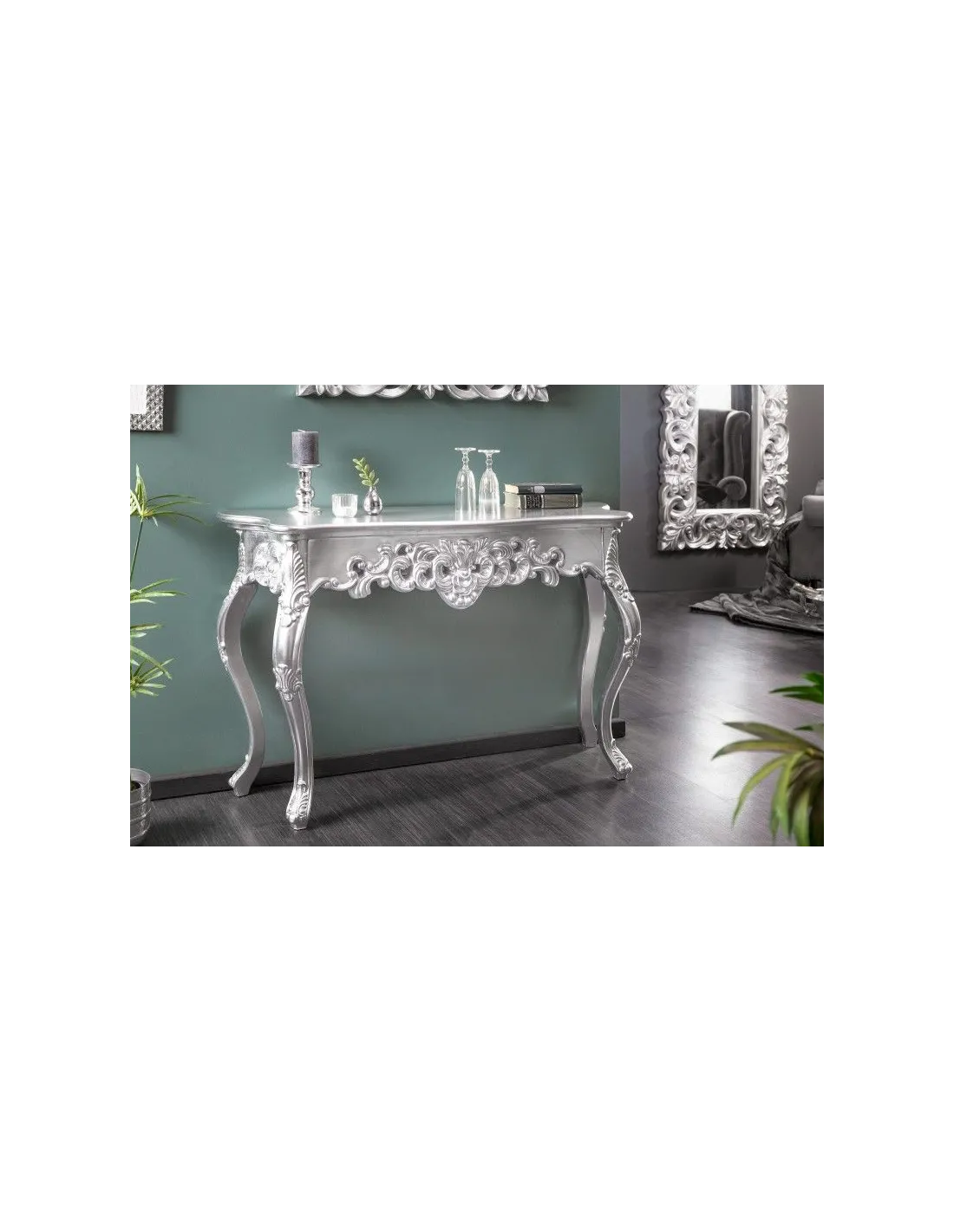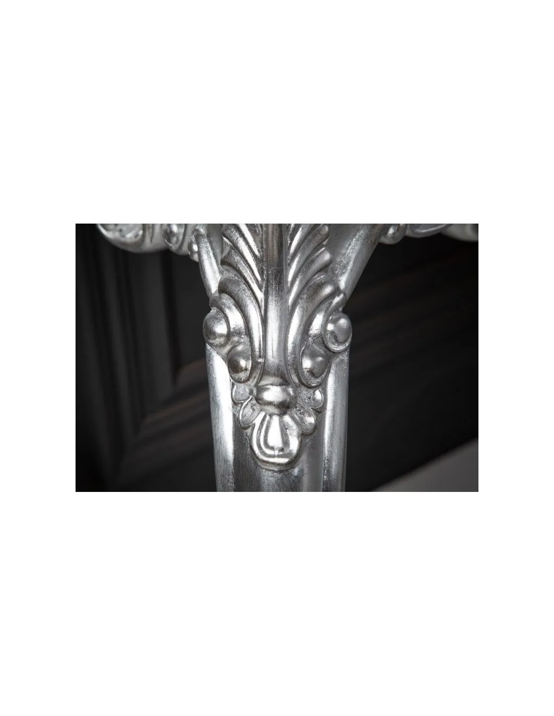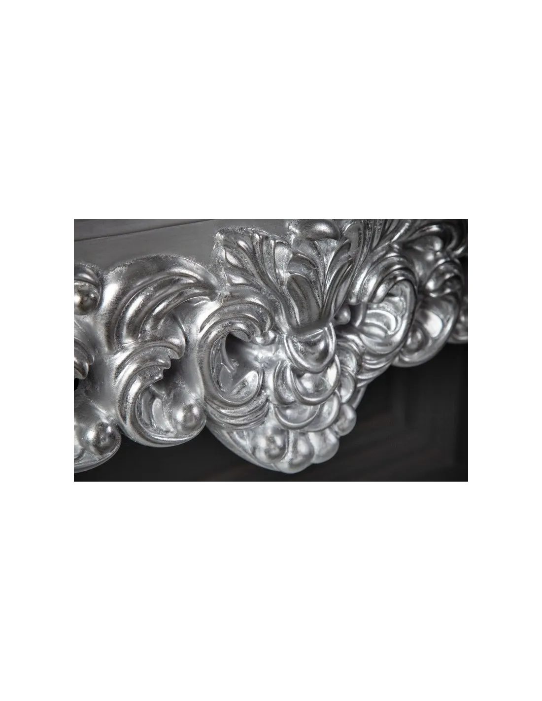 Fabuleuse console classique coloris argent! Fabriquée en bois de haute qualité, orné par des jolies sculptures avec un design baroque,original et unique,car chaque console est faite à la main. Elle est pratique,élégante et multifonctionnelle à la fois avec un coloris chaud et charmant,parfaite à placer dans une entrée ou tout autre pièce raffinée!
