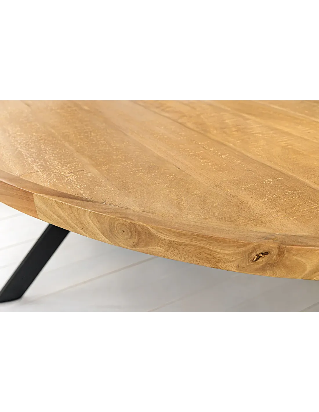 Matériaux : plateau en bois de manguier massif verni, piètement en fer noir poudré