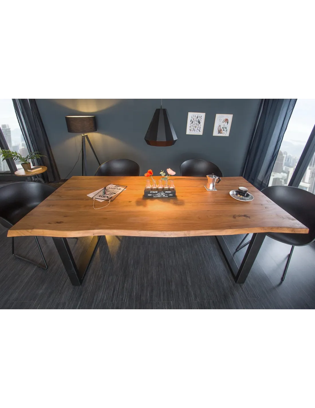 - Esthétique : Le bord en arbre naturel du plateau crée une ambiance chaleureuse et naturelle, tandis que le cadre en acier noir apporte une touche industrielle moderne.