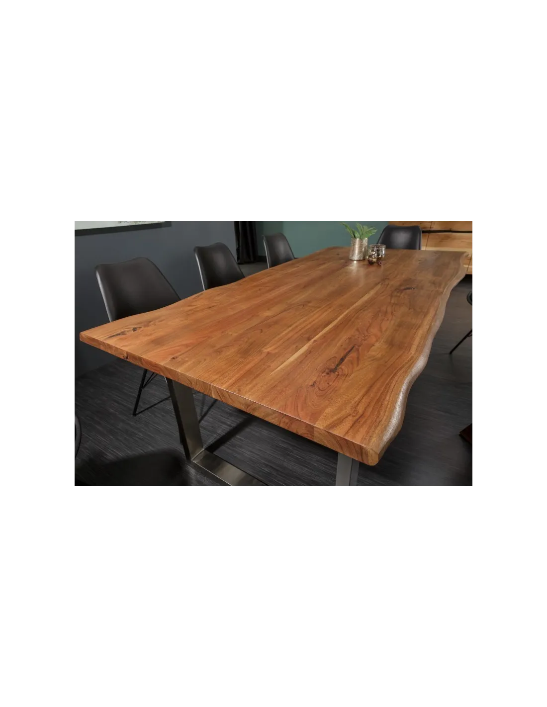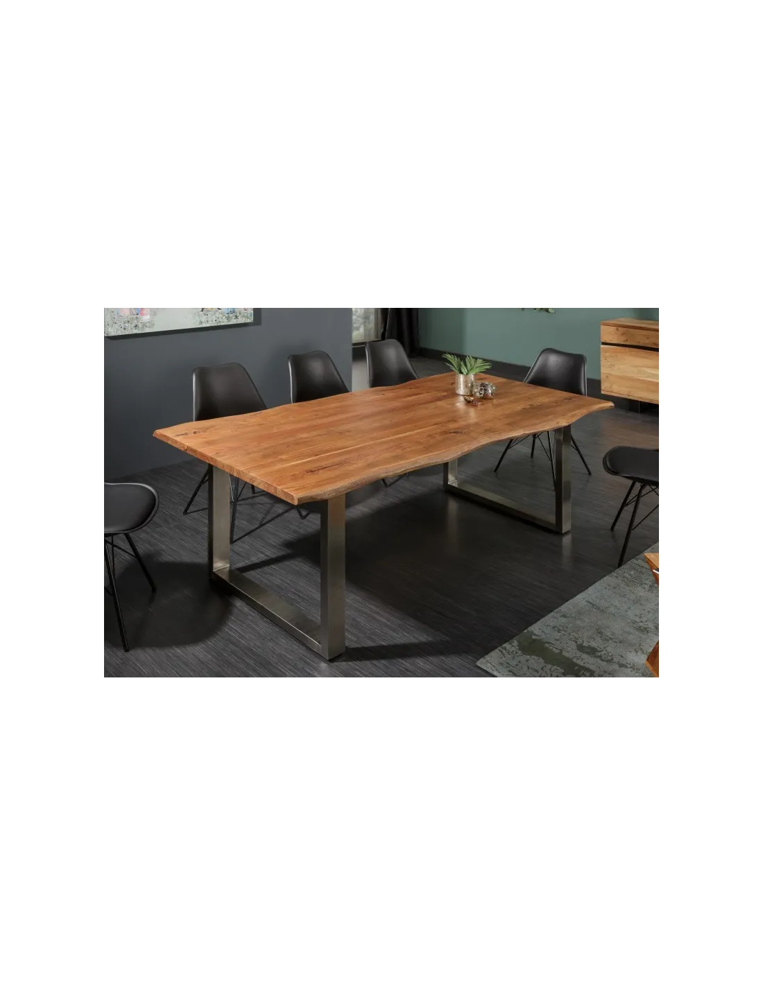 Laissez-vous charmer par le design industriel moderne de cette table à manger pour 8 personnes ! Fabriqué soigneusement en bois d'acacia sauvage massif de 35mm d'épaisseur, avec un bord d'arbre naturel et un cadre en acier de couleur argenté, peint par poudrage dans un aspect industriel rugueux.