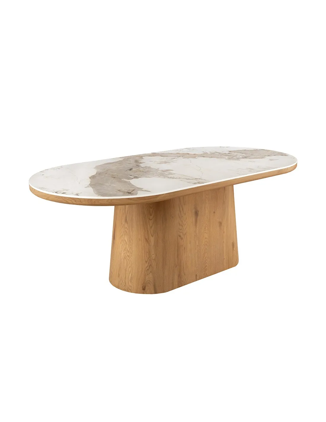 Sublimez votre salle à manger avec la table UNIQUE 200 cm, un modèle d’exception qui associe avec finesse matériaux nobles et design moderne. Son plateau en céramique effet marbre blanc, à la fois lumineux et raffiné, repose sur une structure ovale en bois plaqué noyer verni, offrant un contraste harmonieux et une grande stabilité.