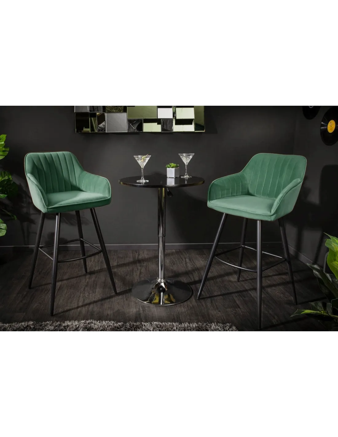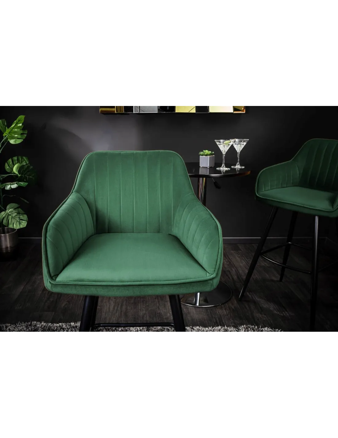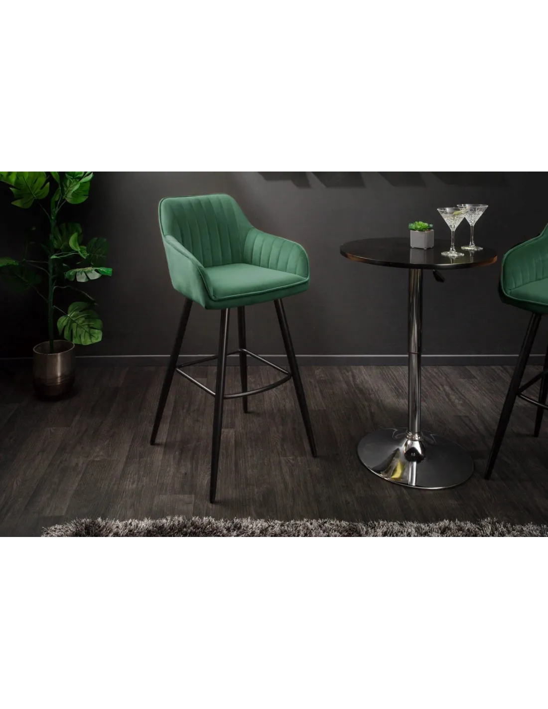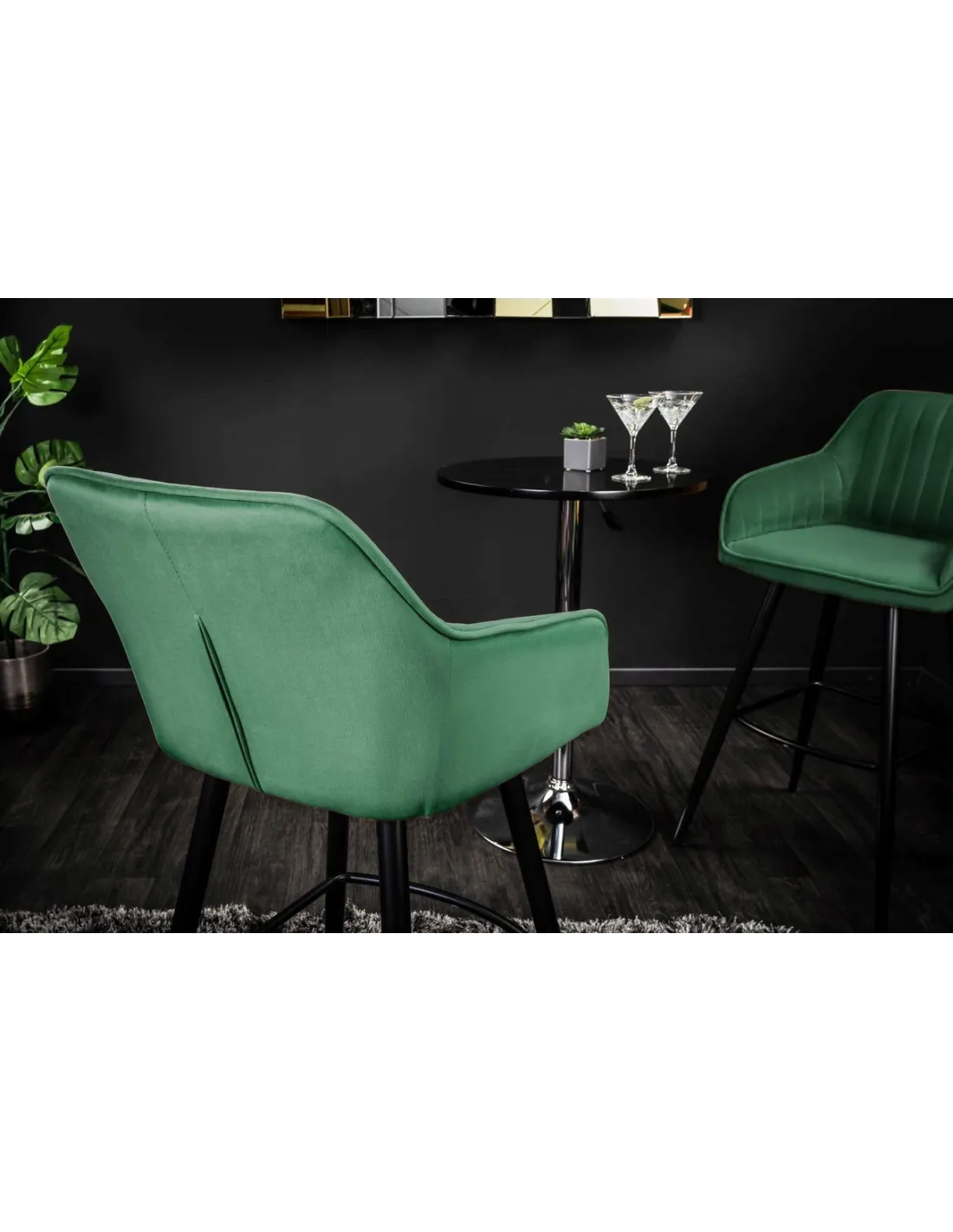 Luxueux tabouret de bar avec assise très confortable ! doté d'accoudoirs pour plus de confort, revêtu joliment en velours de premier choix de très belle couleur verte émeraude et un piétement solide en métal coloris noir !