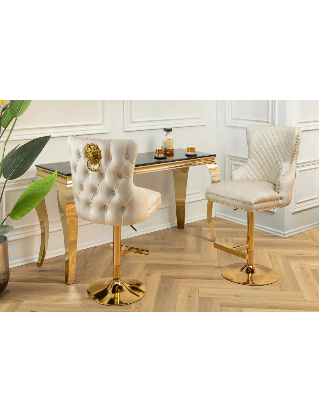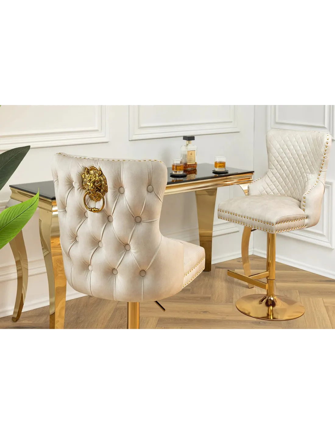 Le tabouret CASTLE se distingue par son allure majestueuse : son dossier orné d’une poignée en tête de lion en métal doré apporte une touche unique et noble.