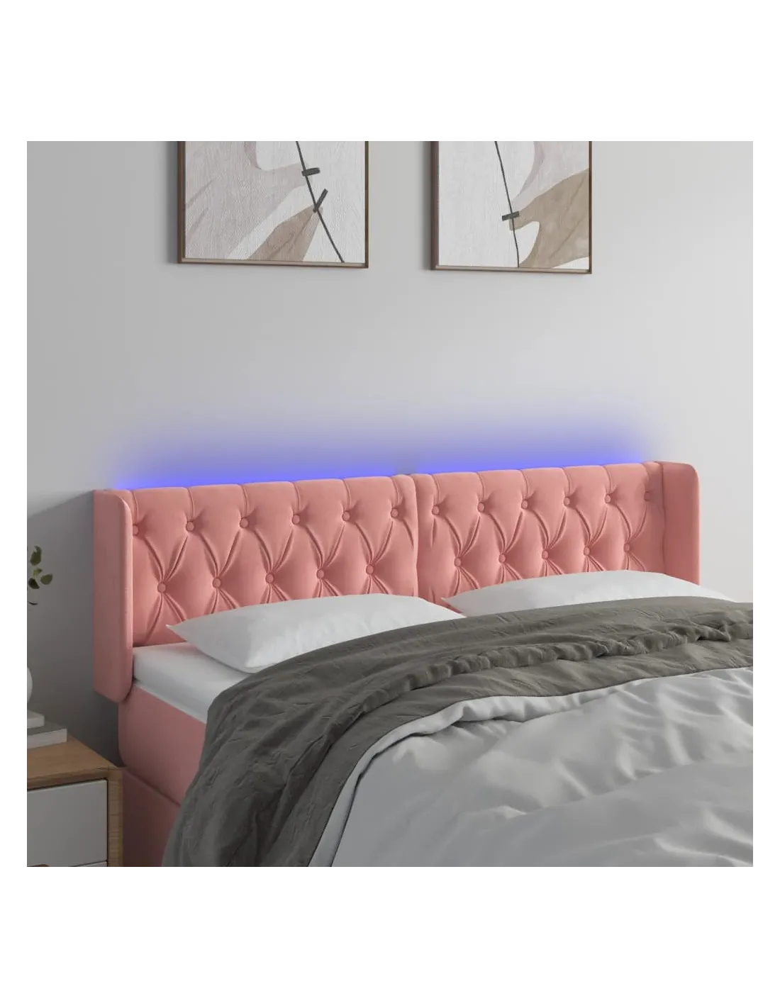 Cette tête de lit à LED classique, au design élégant, donne à votre cadre de lit une touche de modernité étonnante et convient parfaitement à toute chambre à coucher. Velours doux : le velours est un tissu doux et luxueux qui se reconnaît à son tas dense de fibres uniformément coupées qui ont une touche lisse. Le tissu en velours présente un toucher doux distinctif, ce qui le rend confortable au toucher.LED colorée : apportez de l'éclairage dans l'obscurité avec des lumières LED colorées !Hauteur réglable : la tête de lit est réglable en hauteur selon vos préférences.Excellent soutien : la tête de lit vous offre un excellent soutien du dos lorsque vous êtes assis dans votre lit pour lire ou regarder la télévision.Bande à LED découpable : cette bande à LED flexible peut être ajustée en longueur. Le symbole des ciseaux indique où la bande peut être coupée en toute sécurité sans l'endommager. Remarque :Seule la partie avec un symbole de ciseaux peut être coupée et seule la partie avec l'USB continuera à fonctionner comme avant.Chaque produit est livré avec un manuel de montage dans la boîte pour un montage facile.Ce produit est doté d'un connecteur USB, mais la source d'alimentation certifiée de USB 5V n'est pas incluse.